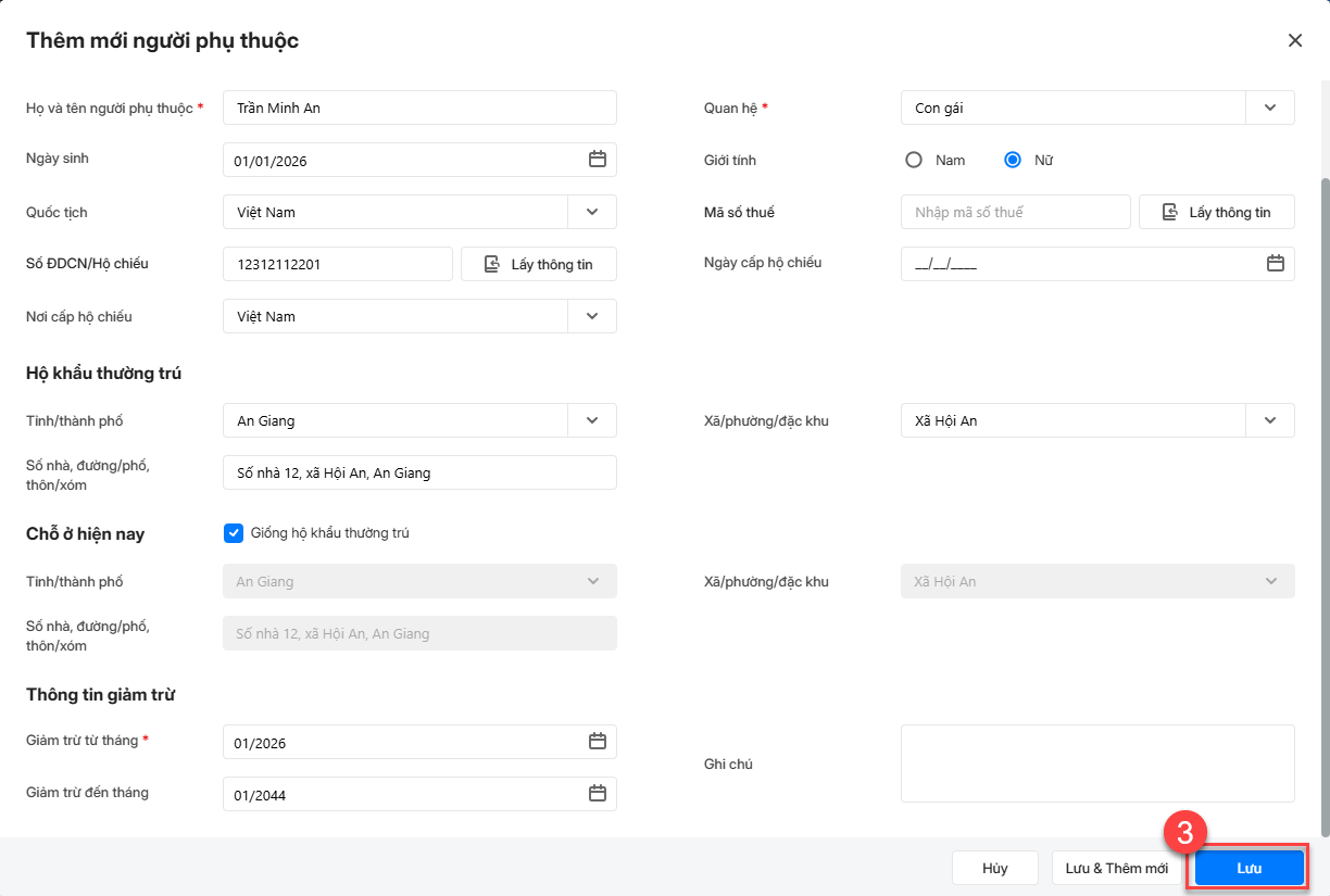 Nhấn Lưu để thêm người phụ thuộc vào tờ khai.