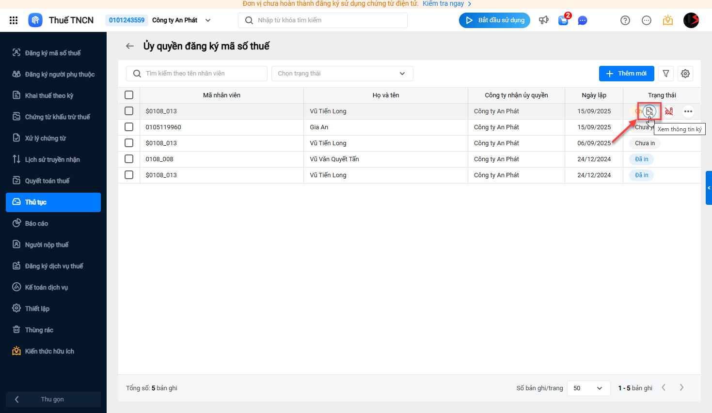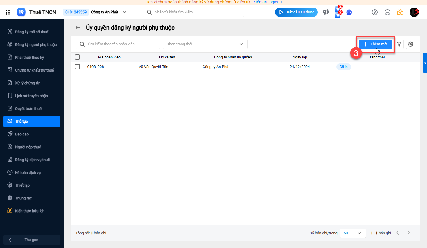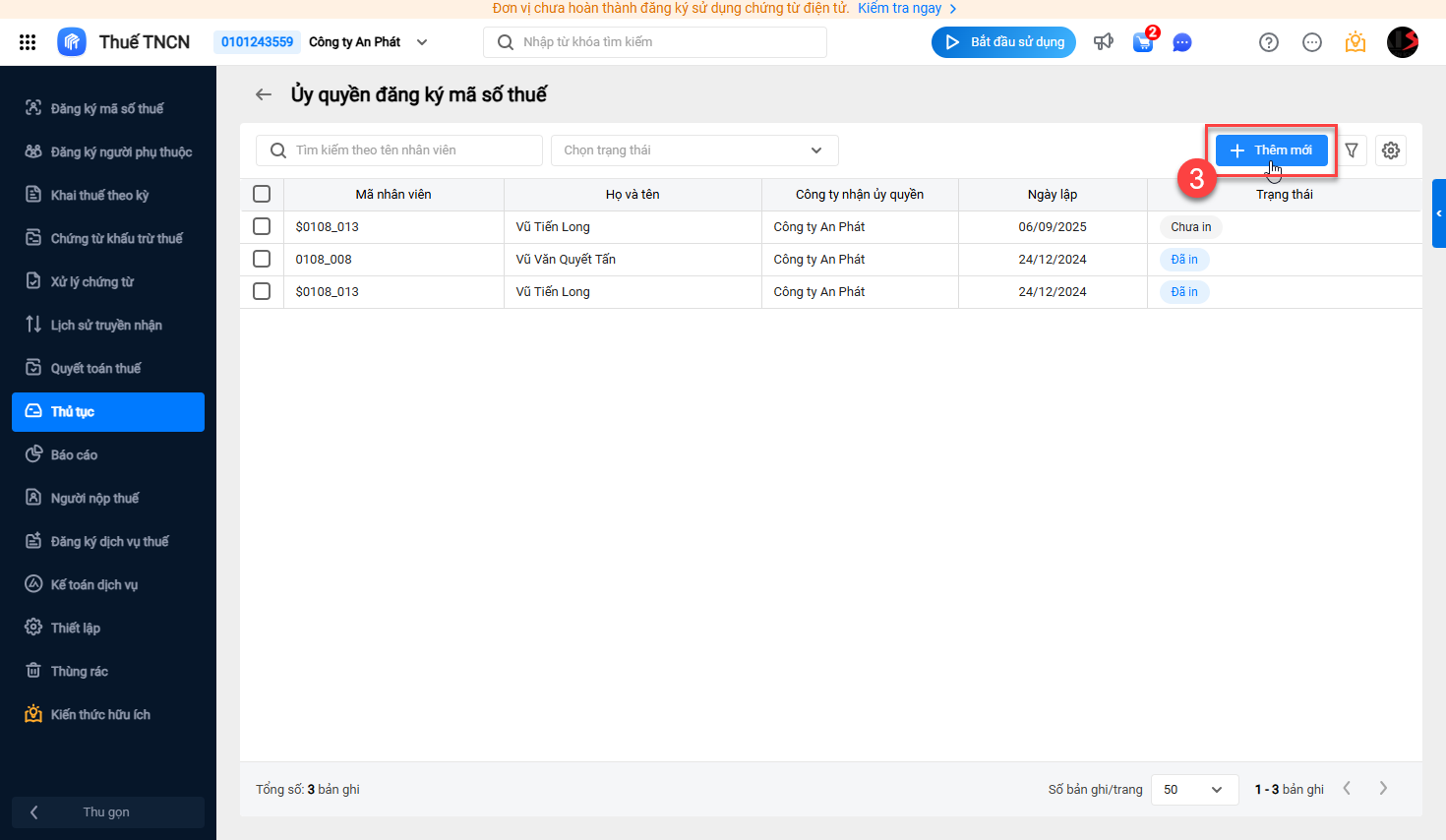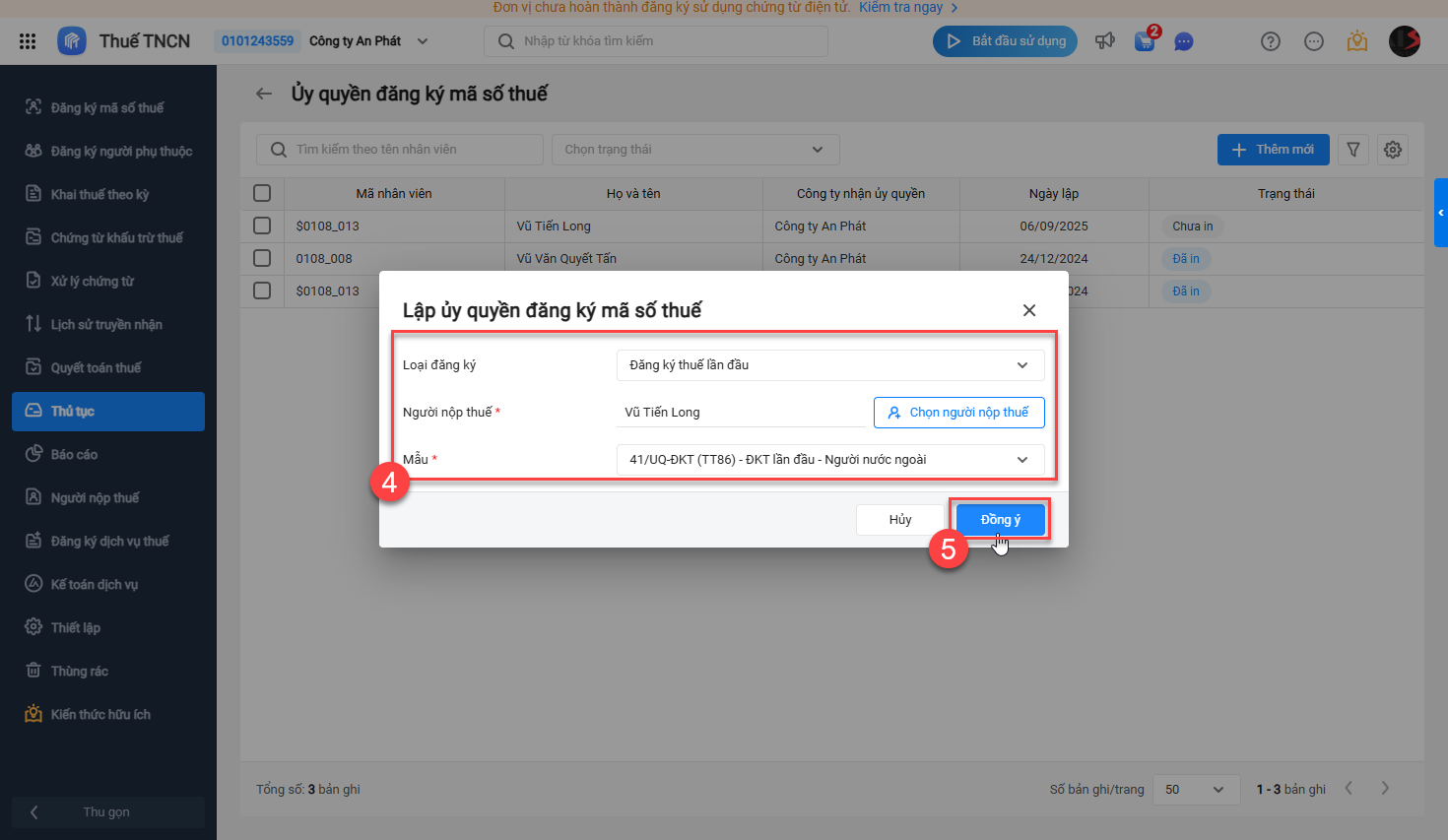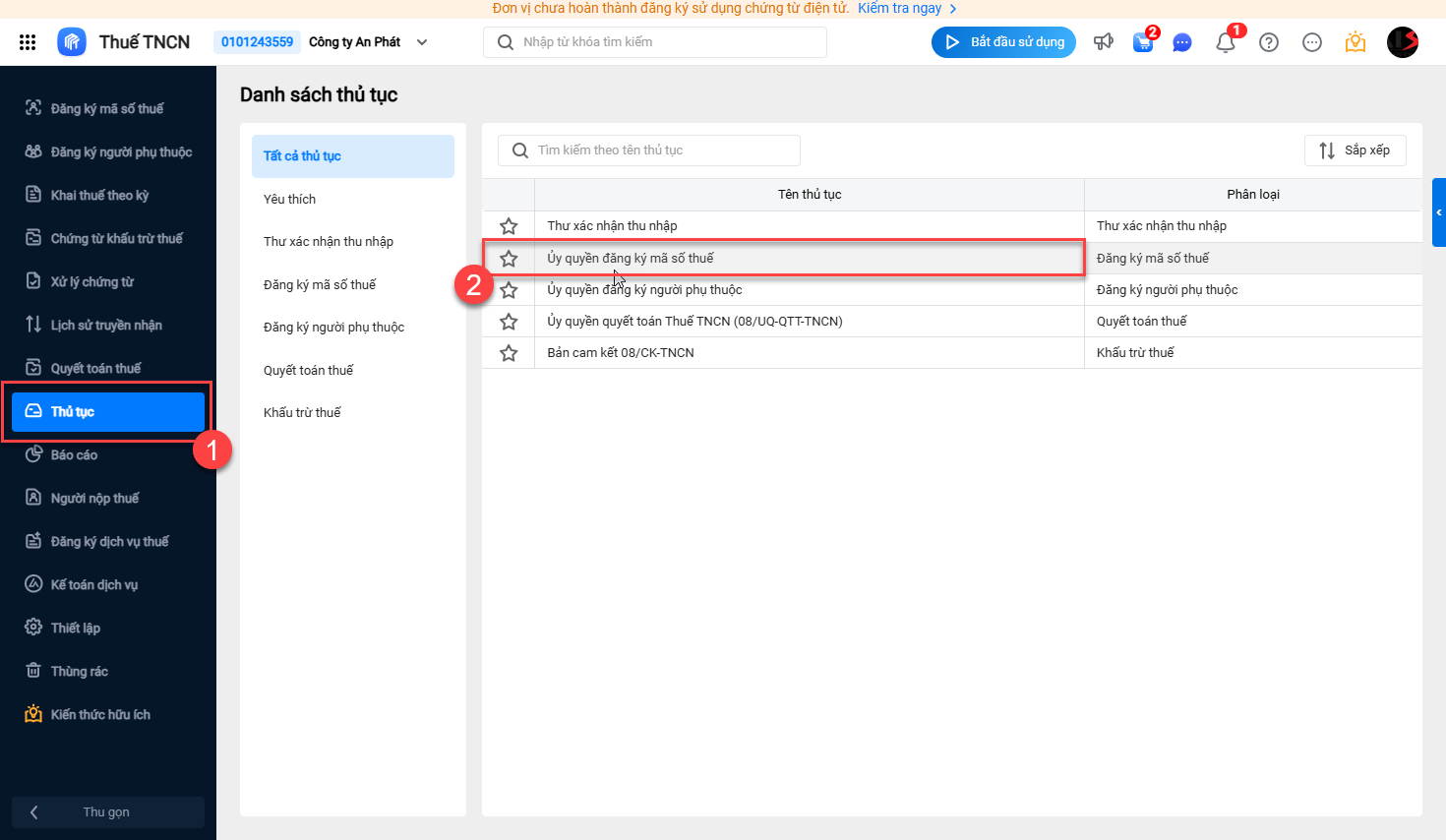 • Tại phân hệ Thủ tục, chọn mục Ủy quyền đăng ký mã số thuế.