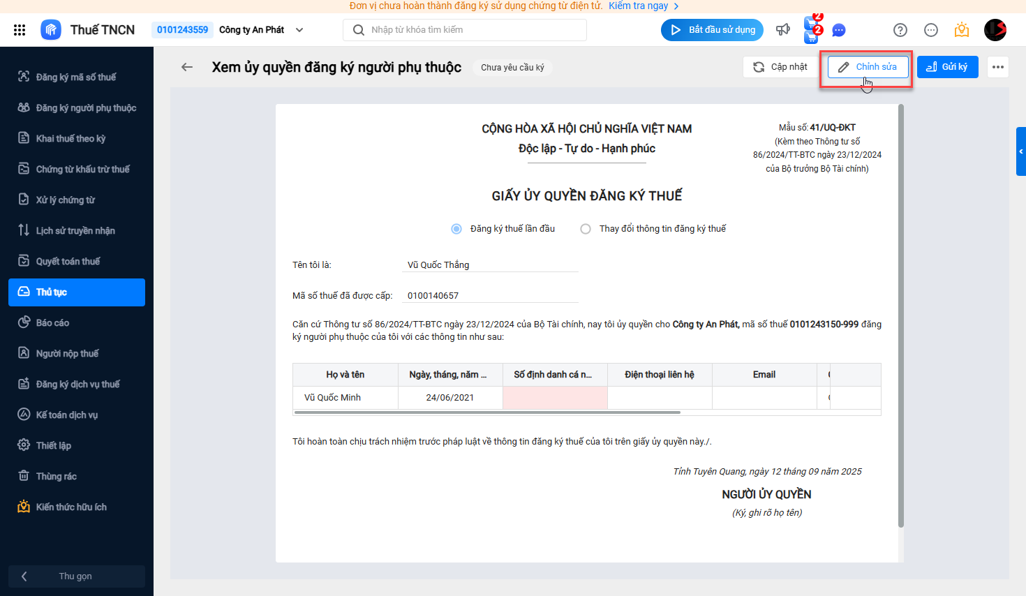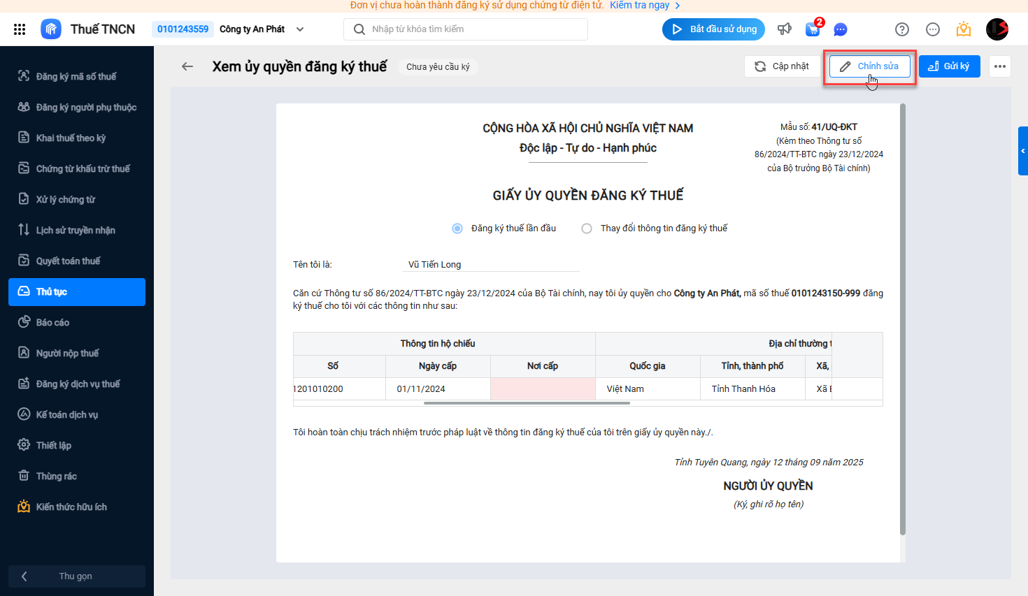 • Nhấn Chỉnh sửa để chỉnh sửa/bổ sung thông tin giấy ủy quyền.