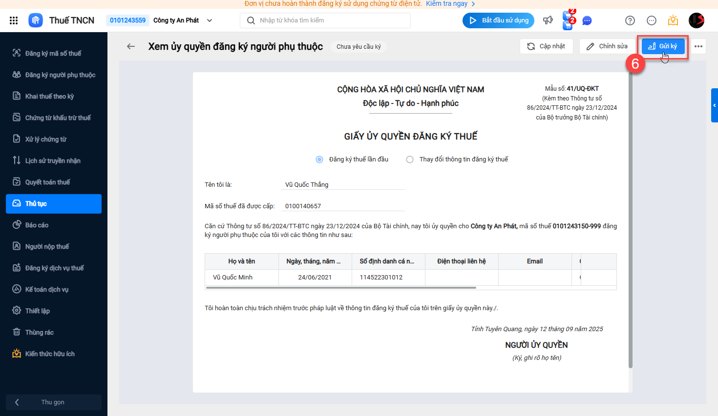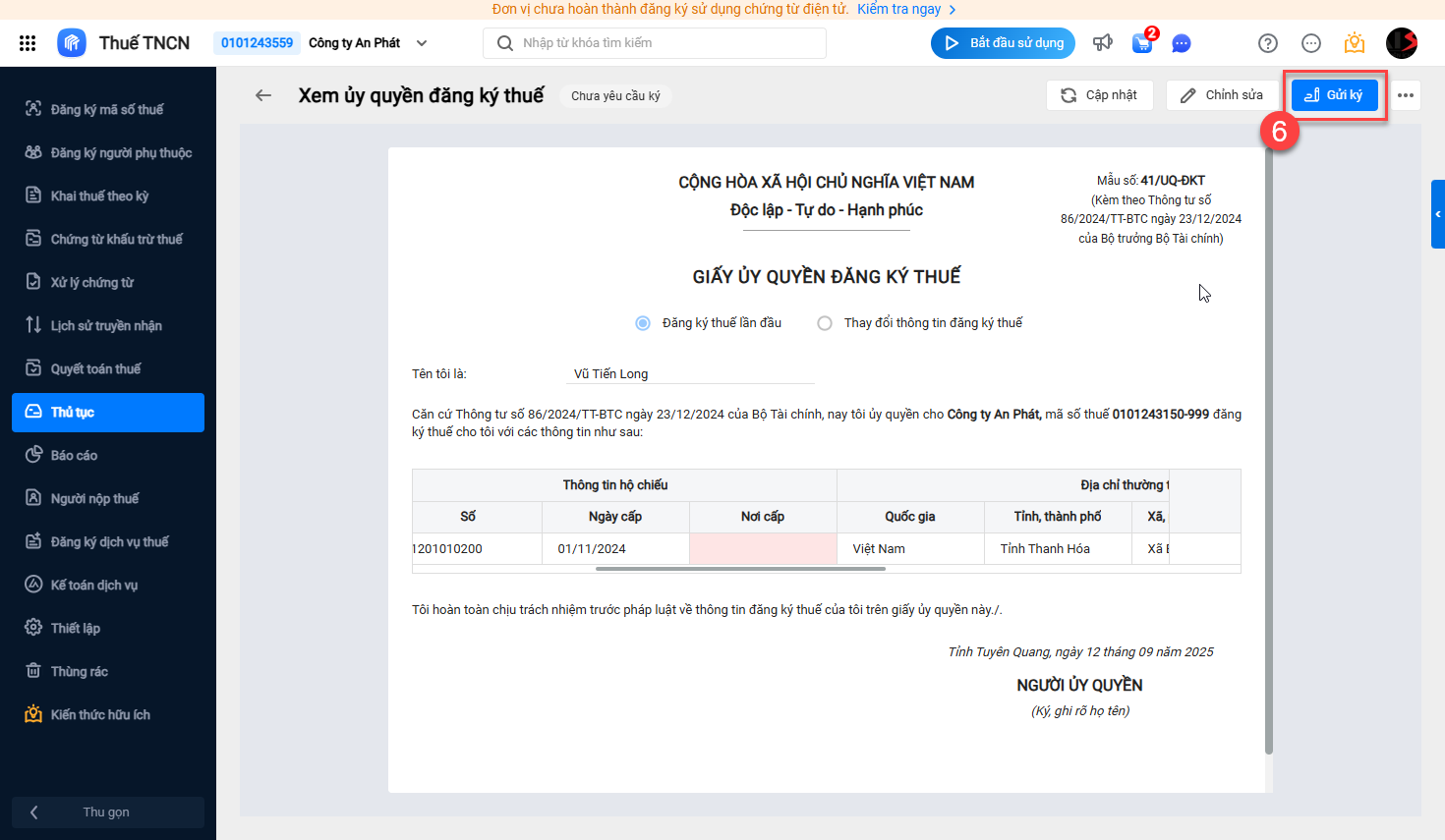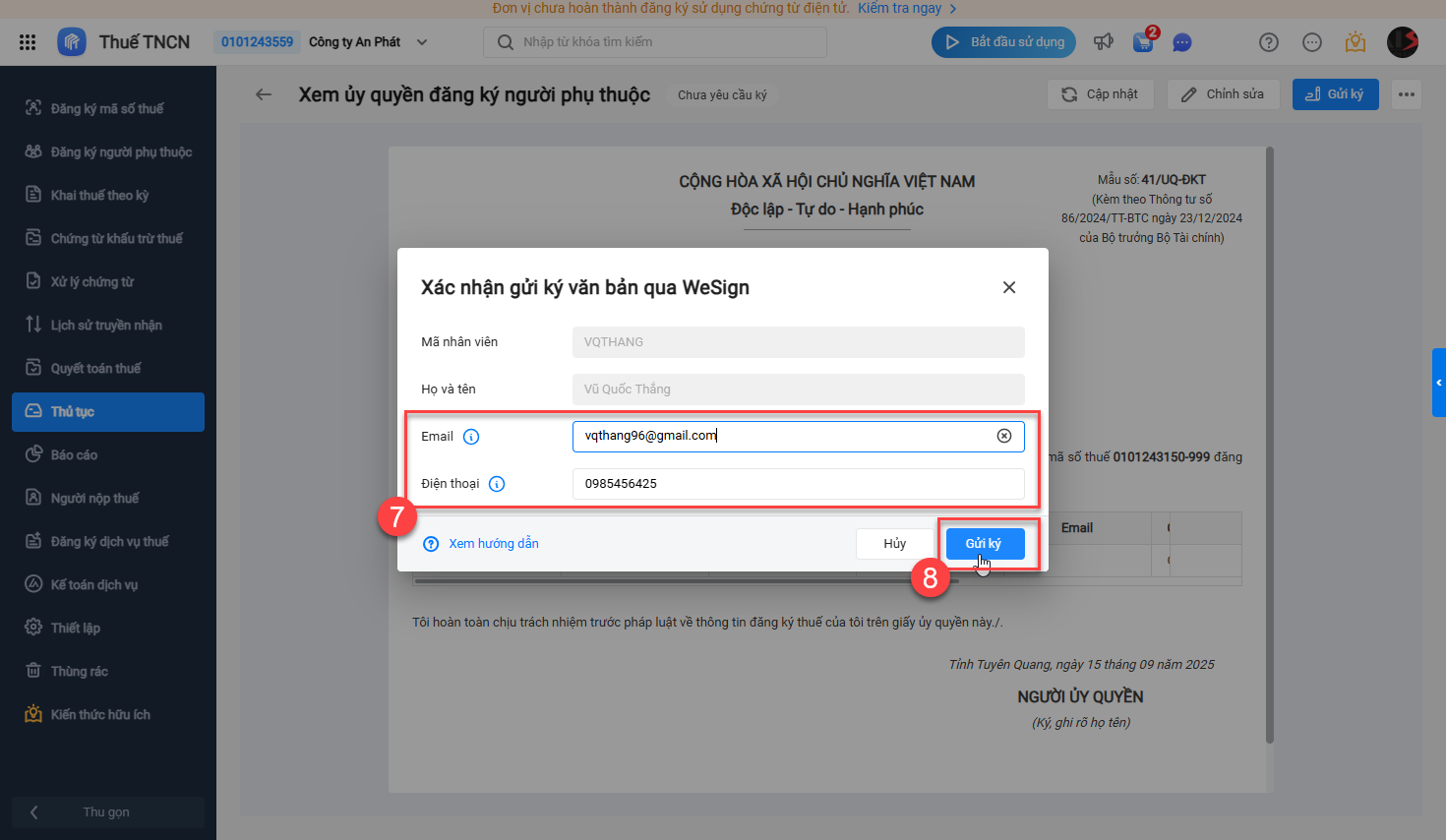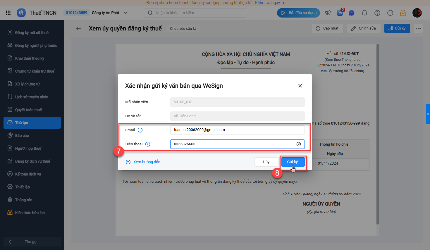 • Nhấn Gửi ký để gửi ký giấy ủy quyền qua WeSign.