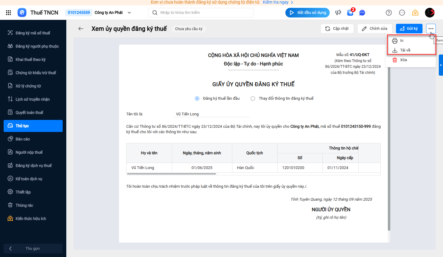 1. Lập và in văn bản ủy quyền đăng ký mã số thuế