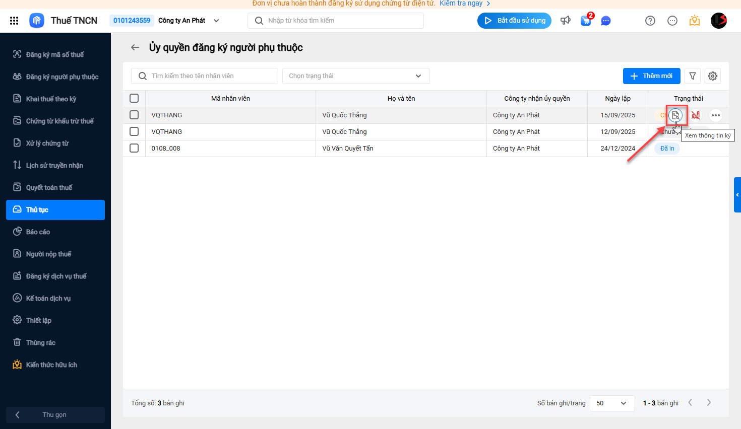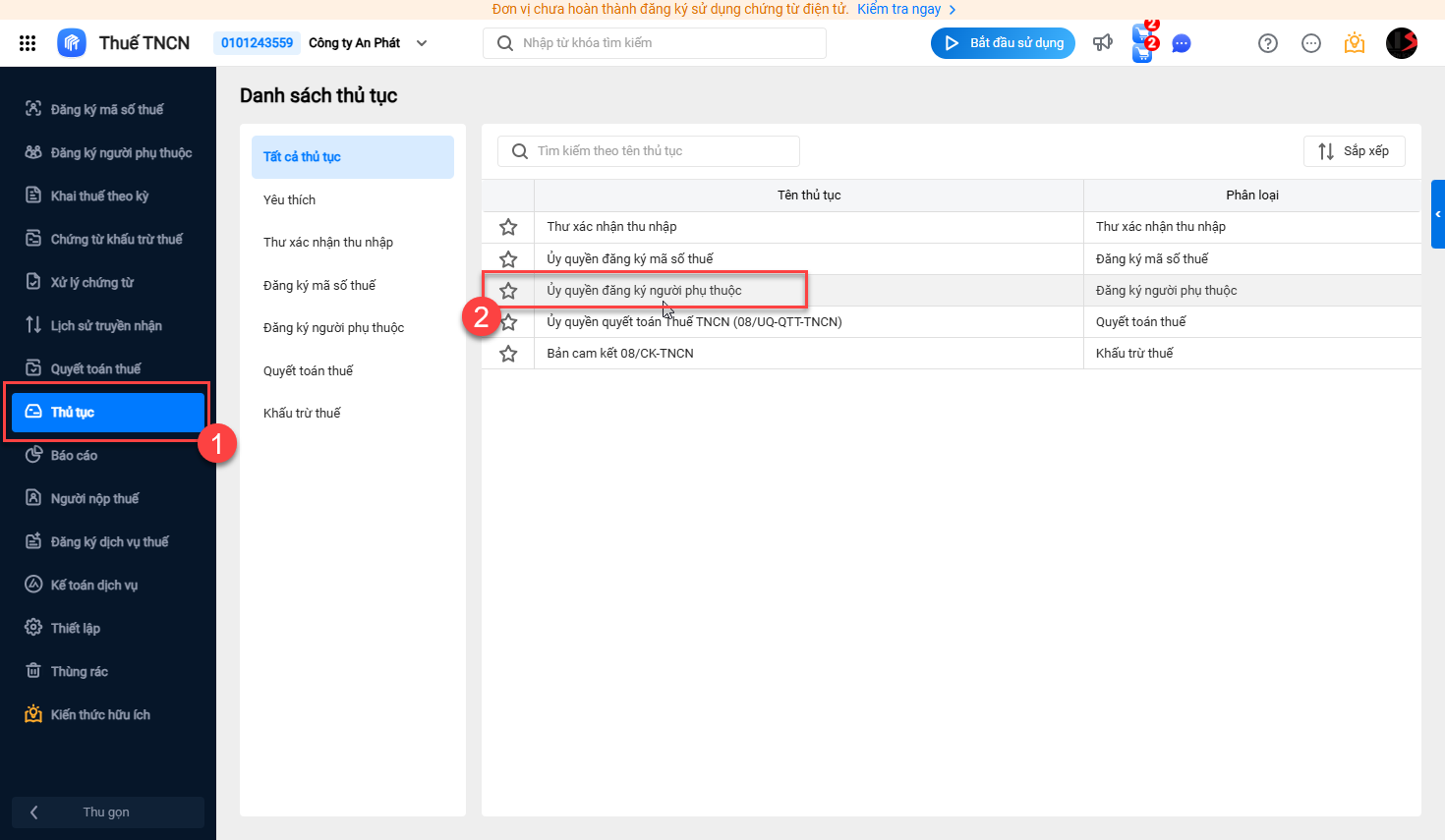 • Tại phân hệ Thủ tục, chọn mục Ủy quyền đăng ký người phụ thuộc.