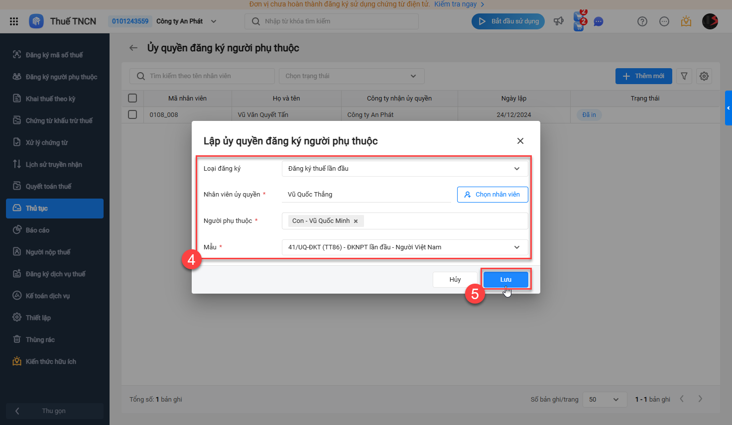 • Chọn loại đăng ký, Nhân viên ủy quyền, Người phụ thuộc, Mẫu ủy quyền\nhấn Lưu.