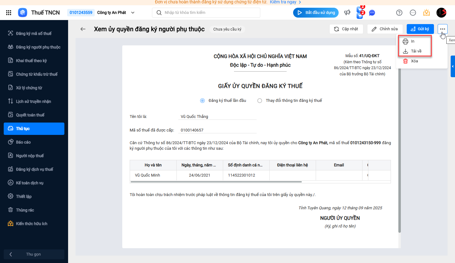 2. Lập và in văn bản ủy quyền đăng ký người phụ thuộc