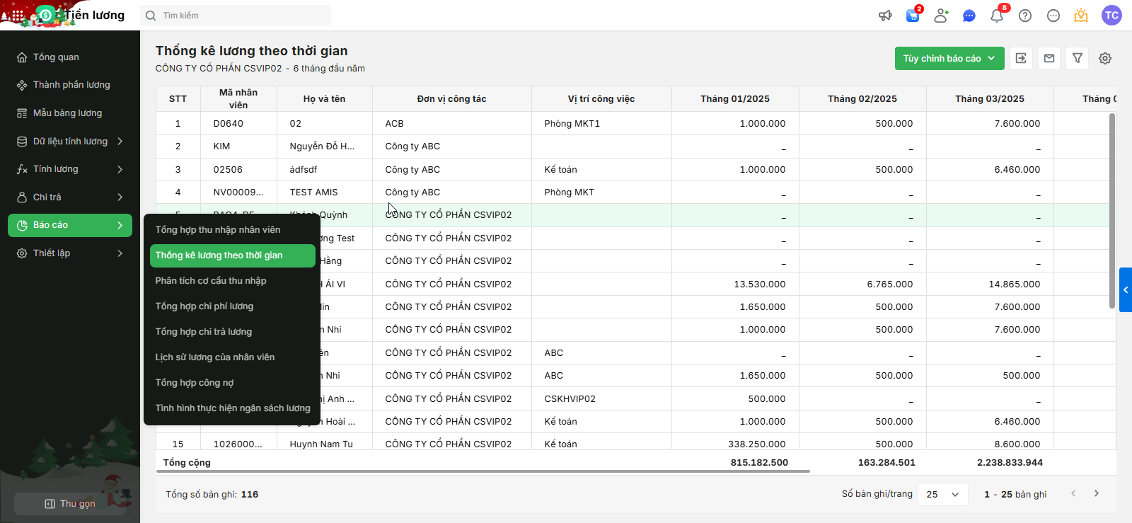 Giúp HR theo dõi, báo cáo các khoản thu nhập và khấu trừ của nhân viên từng phòng ban, vị trí và đánh giá, cân đối chi phí của doanh nghiệp. ![]() Chương trình thống kê theo Nhân viên/Vị trí công việc/Phòng ban. 2.2 Thống kê lương theo thời gian