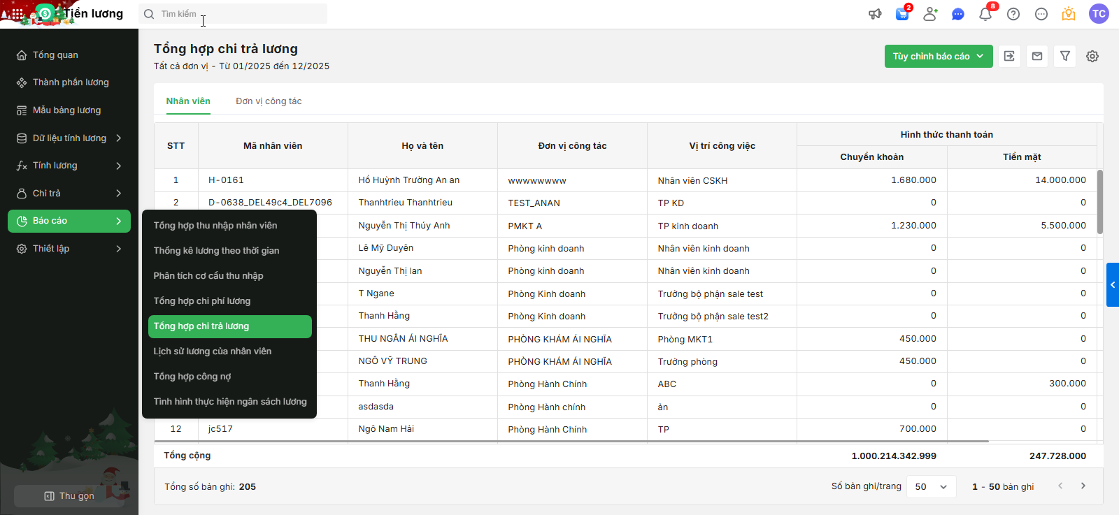 2.5 Tổng hợp chi trả lươngGiúp HR/Ban lãnh đạo theo dõi được báo cáo tổng hợp chi trả lương theo từng nhân viên, phòng ban của đơn vị để nắm bắt được tình hình chi trả tiền lương của công ty.