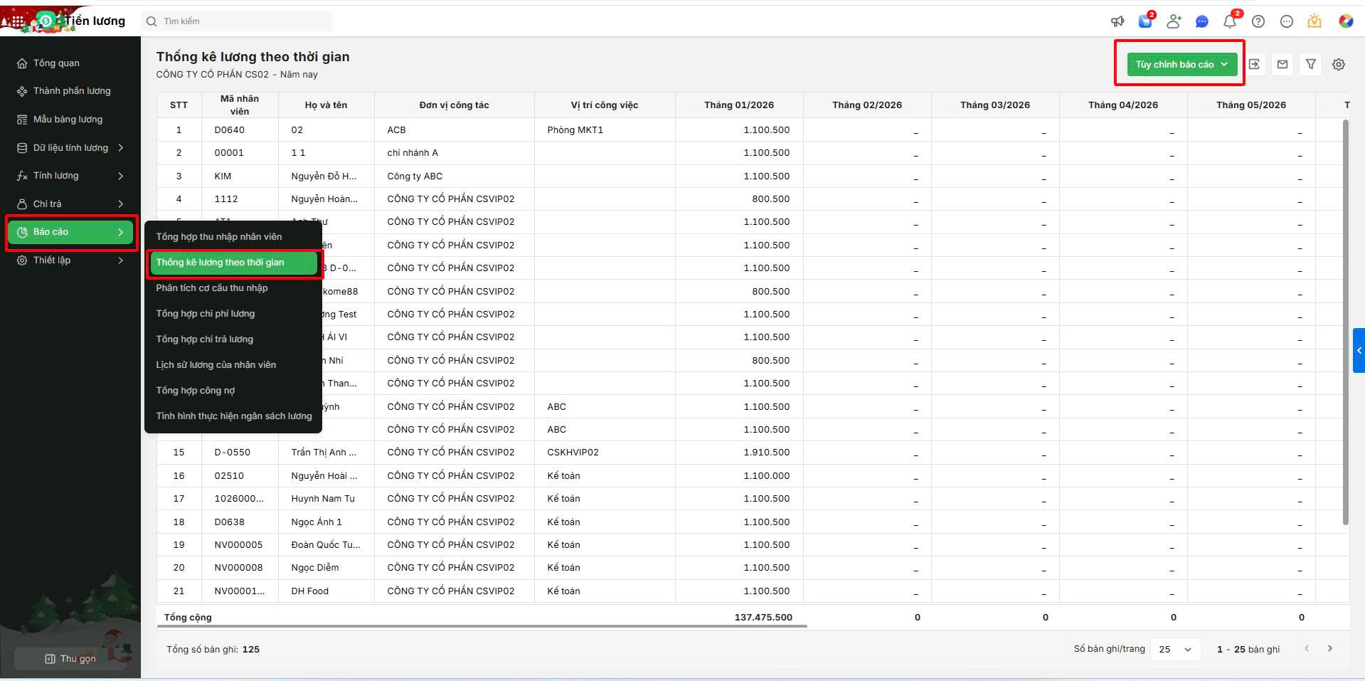 Trên giao diện phân hệ Báo cáo \ Thống kê lương theo thời gian \ Tùy chỉnh báo cáo ( thiết lập tham số: Kỳ báo cáo, Thống kê theo,…) \ Nhấn đồng ý, phần mềm hiển thị kết quả thống kê như đã thiết lập .