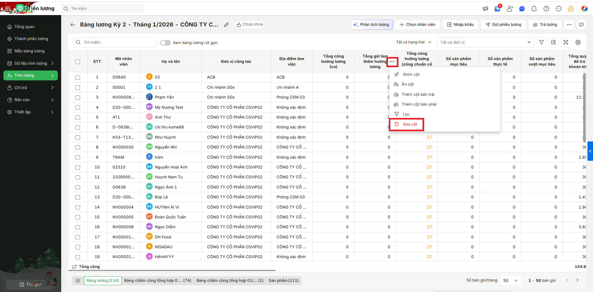 - Tại phân hệ Tính lương \ Bảng lương \ Nhấn đúp vào bảng lương cần xóa cột \ Di chuột vào cột cần xóa \ Nhấn dấu ba chấm \ Chọn Xóa cột