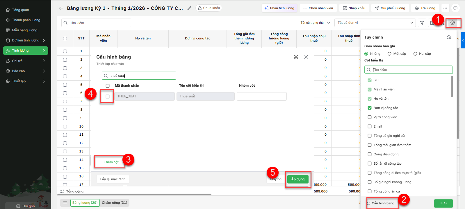 – Thêm cột Thuế suất vào bảng lương, bảng thuế