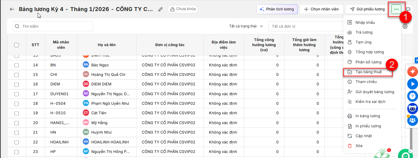 Bước 1: Vào phân hệ Tiền lương \ chọn Bảng lương Bước 2: Chọn bảng lương cần tạo bảng thuế Bước 3: Nhấn vào icon Ba dấu chấm ⋯ \ chọn Tạo bảng thuế Bước 4: Nhập Tên bảng thuế Bước 5: Nhấn Lưu Bước 6: Lặp lại thao tác với bảng lương chi trả còn lại Bước 7: Đảm bảo 2 bảng thuế có tên rõ ràng, phân biệt theo đợt chi trả
