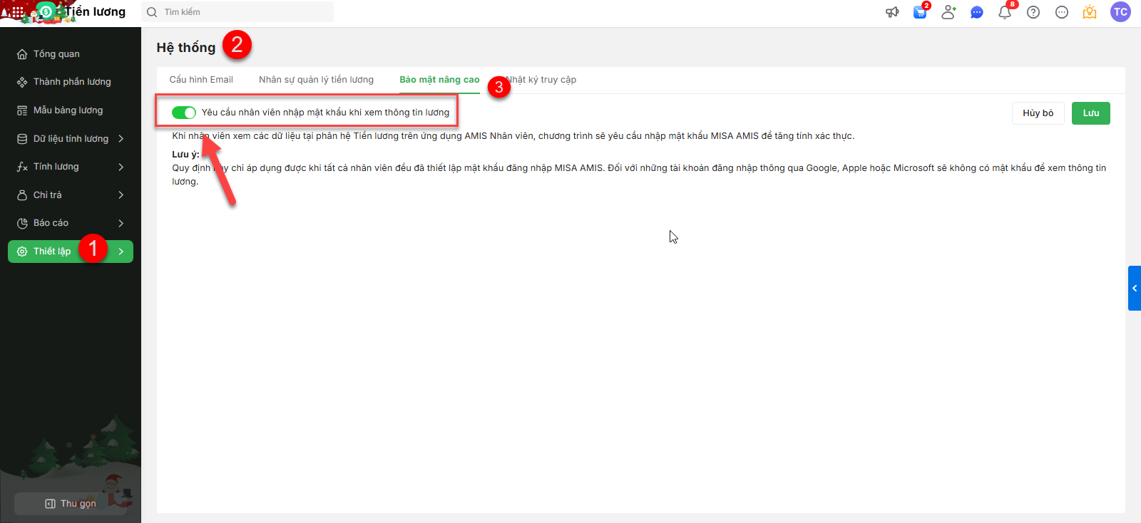 Bước 2: Trong mục Bảo mật nâng cao \ Nhấn Sửa \ Bật thiết lập Yêu cầu nhân viên nhập mật khẩu khi xem thông tin lương.