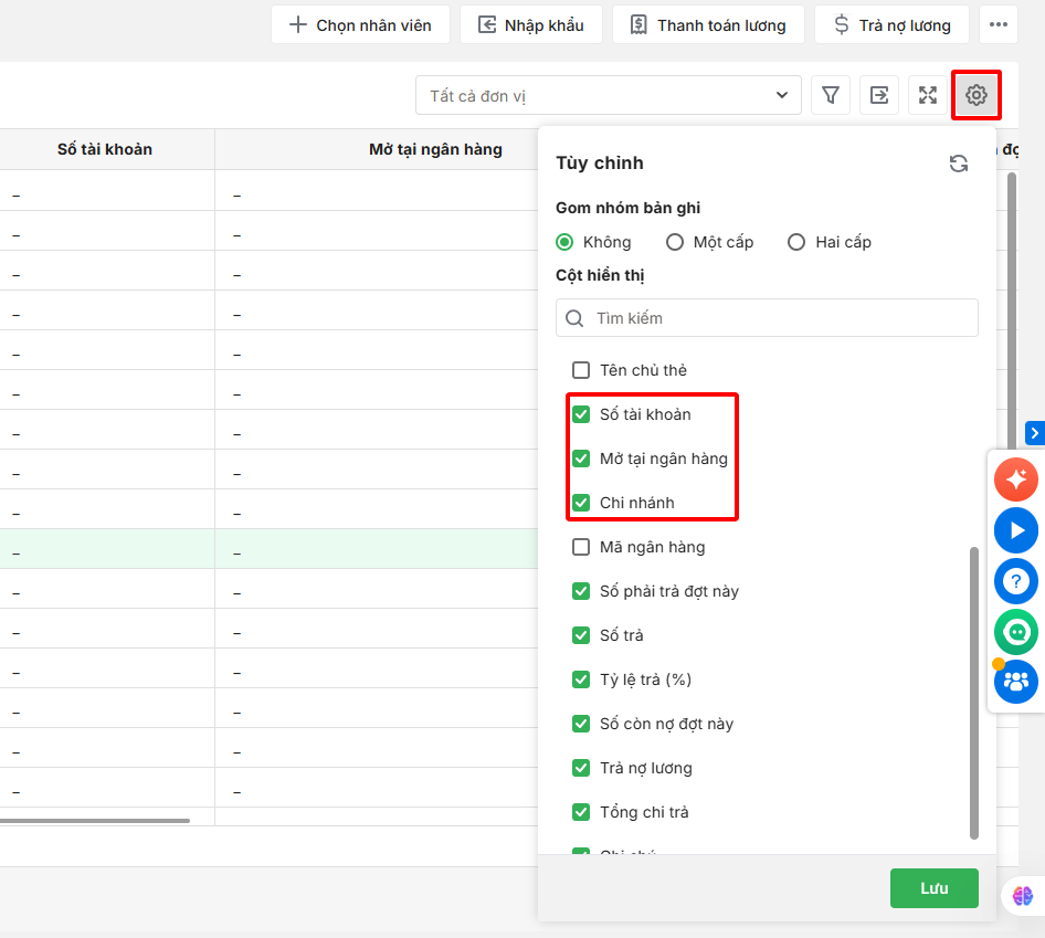 Trong danh sách các cột hiển thị, tìm và tích chọn các thông tin: Số tài khoản, Mở tại ngân hàng, Chi nhánh, …