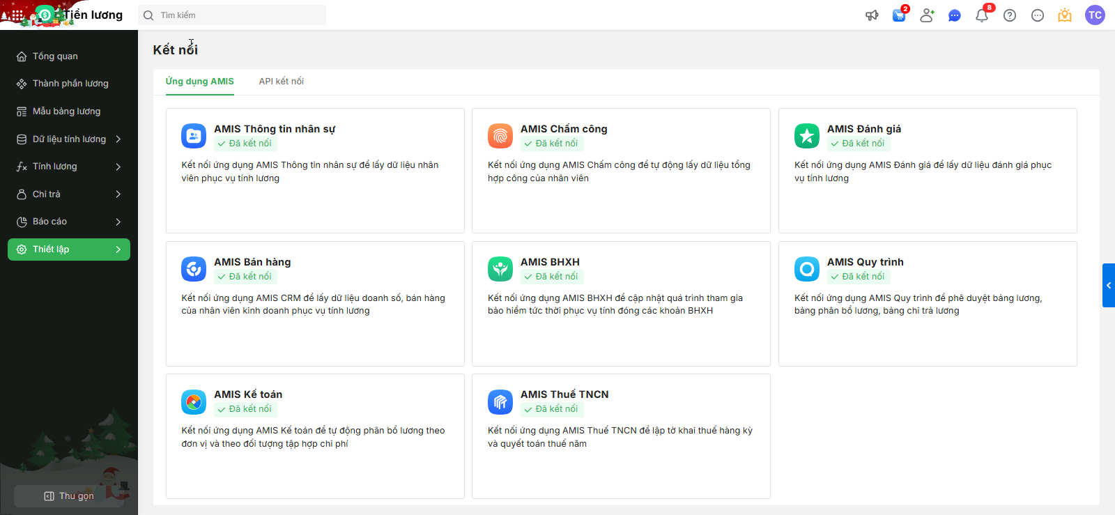 Hiện tại, AMIS Tiền lương đã đáp ứng kết nối với tám ứng dụng là: