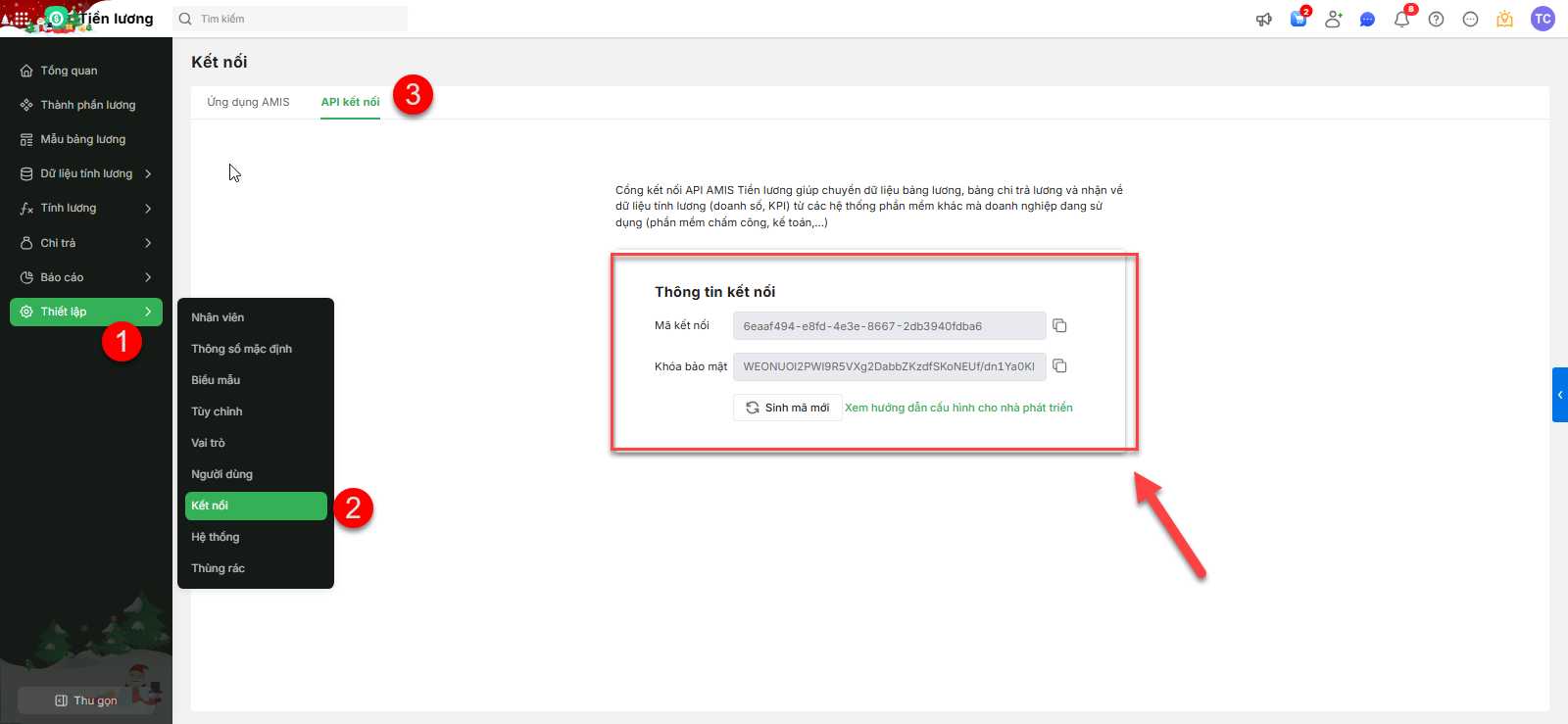 2.2 Các bước thực hiện kết nốiBước 1: Anh chị truy cập vào phân hệ Thiết lập \ Kết nối \ chọn mục API Kết nối để lấy thông tin Mã kết nối và Khóa bảo mật.