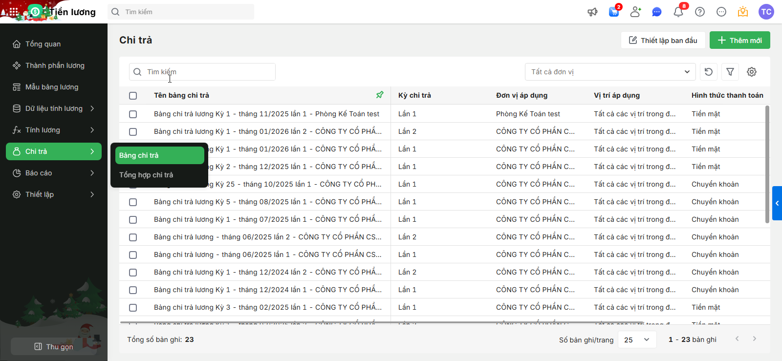 Bước 2: Vào Chi trả \ Bảng chi trả \ Tại bảng chi trả cần thực hiện \ Chọn Trả nợ lương trong trường hợp trong tháng có chi trả nợ lương các tháng trước cùng kỳ lương tháng này.