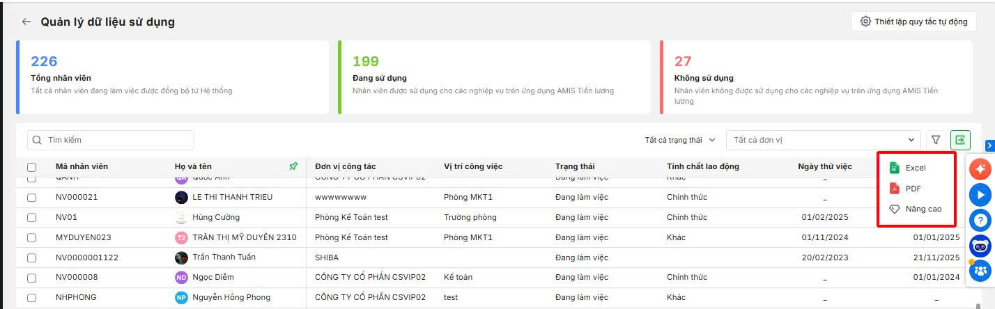 Bài viết nhằm hướng dẫn: Hướng dẫn xuất danh sách nhân viên ra file Excel từ màn hình Quản lý dữ liệu sử dụng.