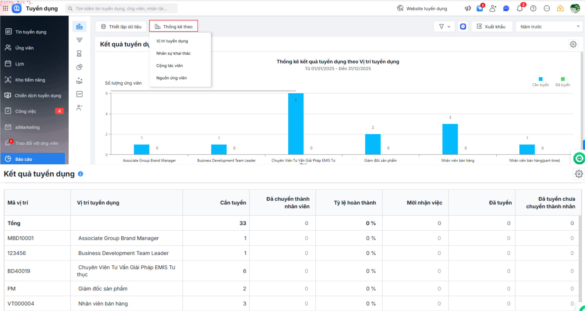 Ví dụ: Khi HR muốn xem báo cáo về kết quả tuyển dụng theo vị trí tuyển dụng, chọn Thống kê theo/Vị trí tuyển dụng.