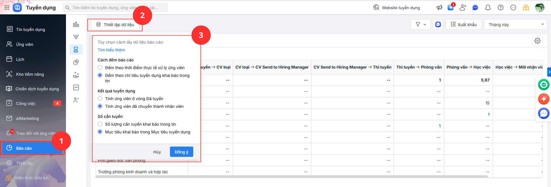 Bước 1: Trên phân hệ Báo cáo\ chọn Báo cáo Thời gian chuyển đổi ứng viên\ chọn Thiết lập dữ liệu.