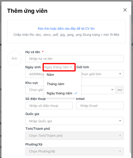 Khi thêm mới ứng viên trên hệ thống, chương trình cho phép cập nhập Tháng sinh; Năm sinh hoặc cập nhật đầy đủ Ngày/Tháng/Năm.