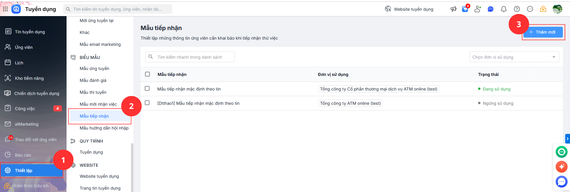 Bước 1: Tại AMIS Tuyển dụng\Chọn phân hệ Thiết lập\Biểu mẫu\Mẫu Tiếp nhận\Thêm mới.