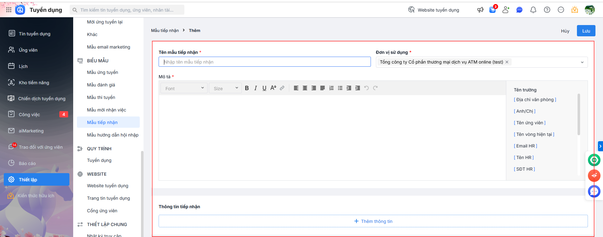 Bài viết nhằm hướng dẫn: Hướng dẫn HR thực hiện thiết lập biểu mẫu Tiếp nhận trên phần mềm AMIS Tuyển dụng để dễ dàng nắm bắt và theo dõi thông tin của ứng viên.