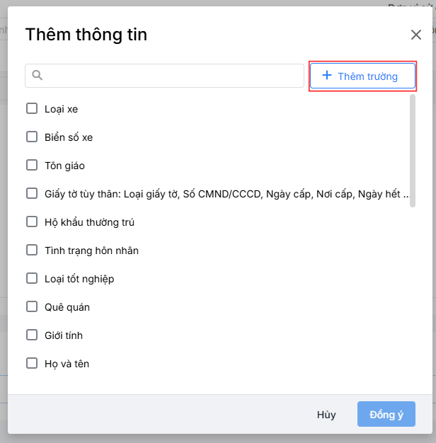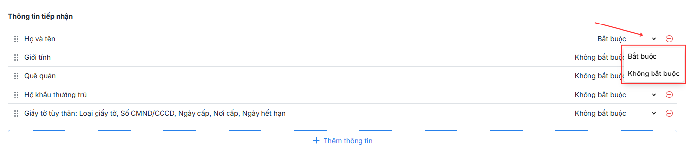 Về phần Thông tin tiếp nhận, chọn Thêm thông tin, phần mềm sẽ tự động hiển thị các thông tin để lựa chọn hoặc có thể tự thêm, sửa các trường thông tin theo ý muốn. Sau khi thêm các thông tin tiếp nhận, Anh/Chị có thể lựa chọn bắt buộc/không bắt buộc cho thông tin đó.