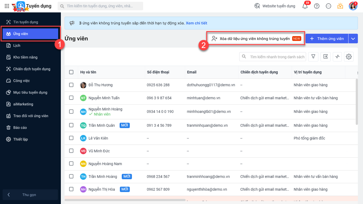 Tại Ứng viên\nhấn Xóa dữ liệu ứng viên không trúng tuyển.