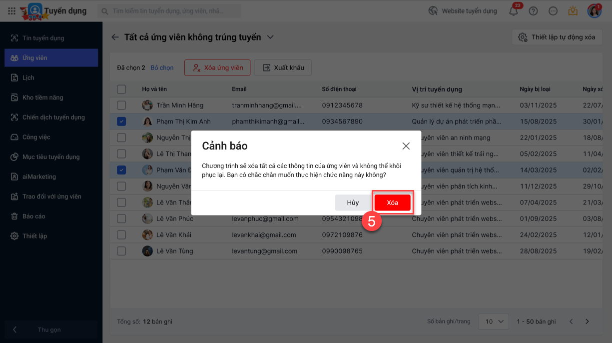 Tích chọn 1 hoặc nhiều ứng viên\nhấn Xóa ứng viên.