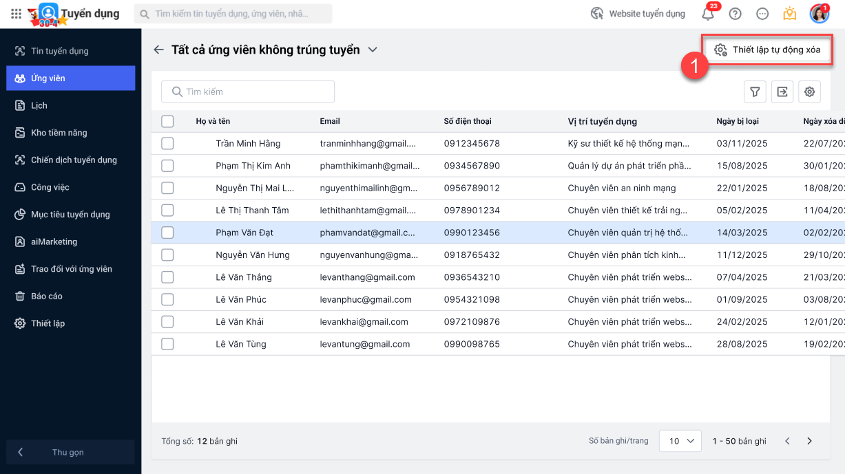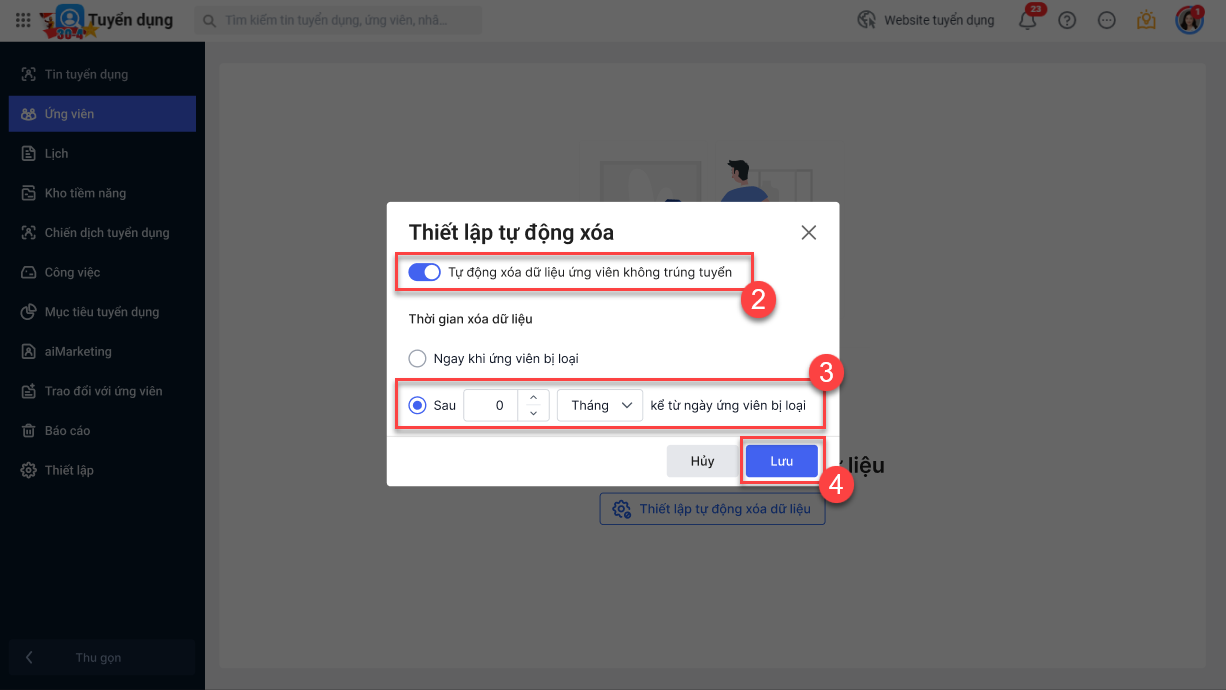 Ngoài ra có thể thiết lập tự động xóa, chương trình sẽ tự động xóa dữ liệu ứng viên không trúng tuyển theo đúng thời gian đã thiết lập: