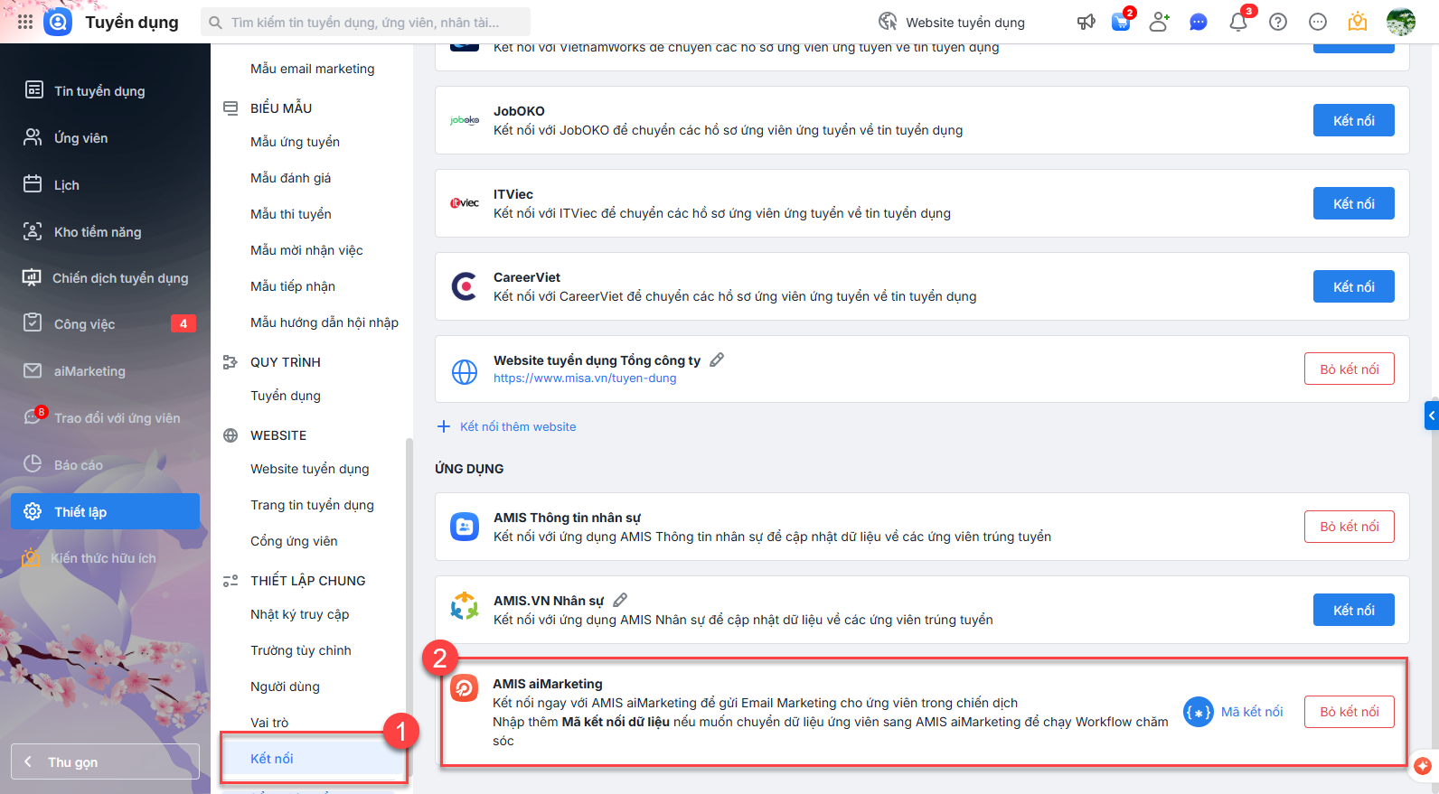 Bước 1: Kết nối AMIS Tuyển dụng với aiMarketing