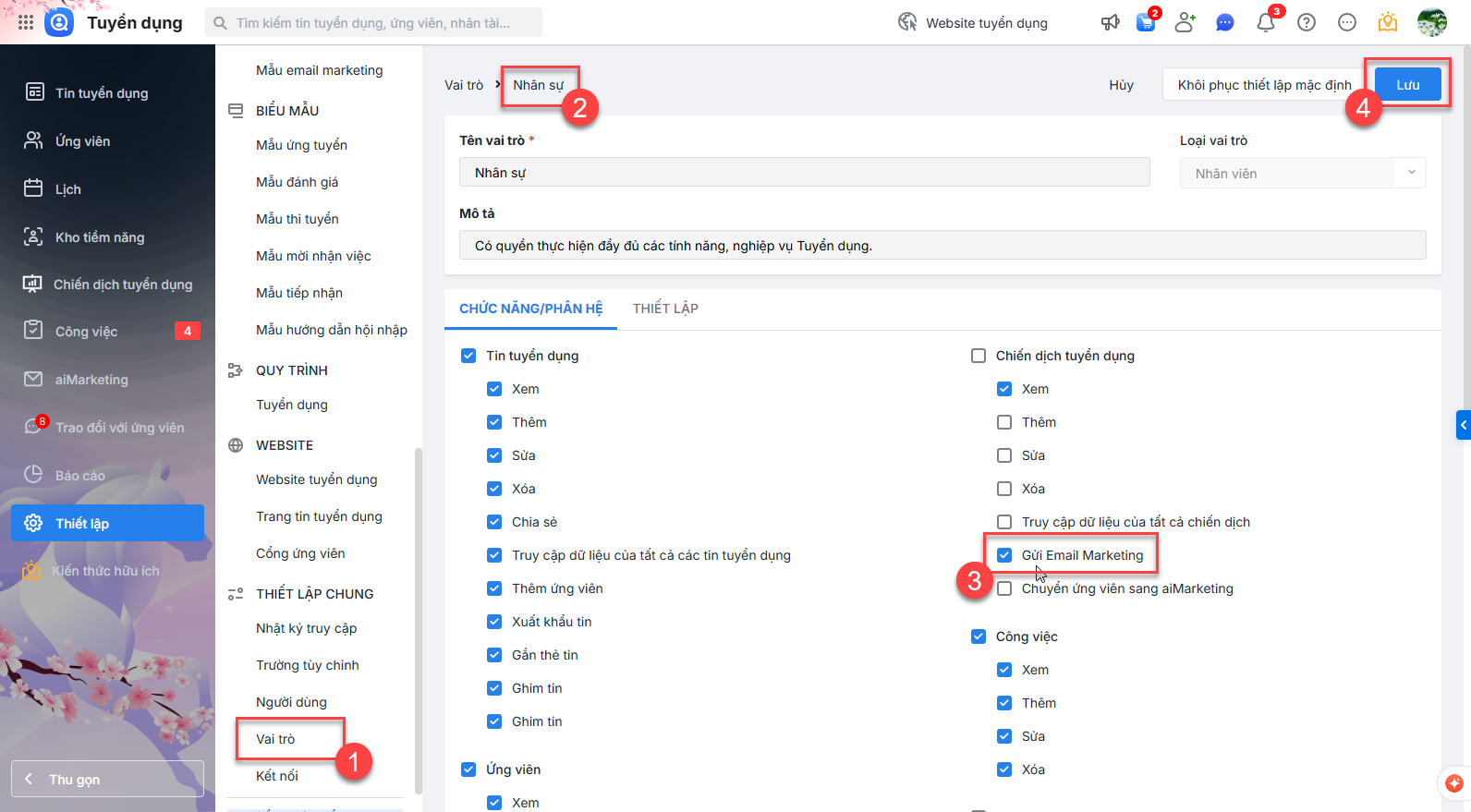 Tại Thiết lập\ Thiết lập chung\ Vai trò\ nhấn Sửa tại Nhân sự\ tích chọn Gửi email marketing\ nhấn Lưu.