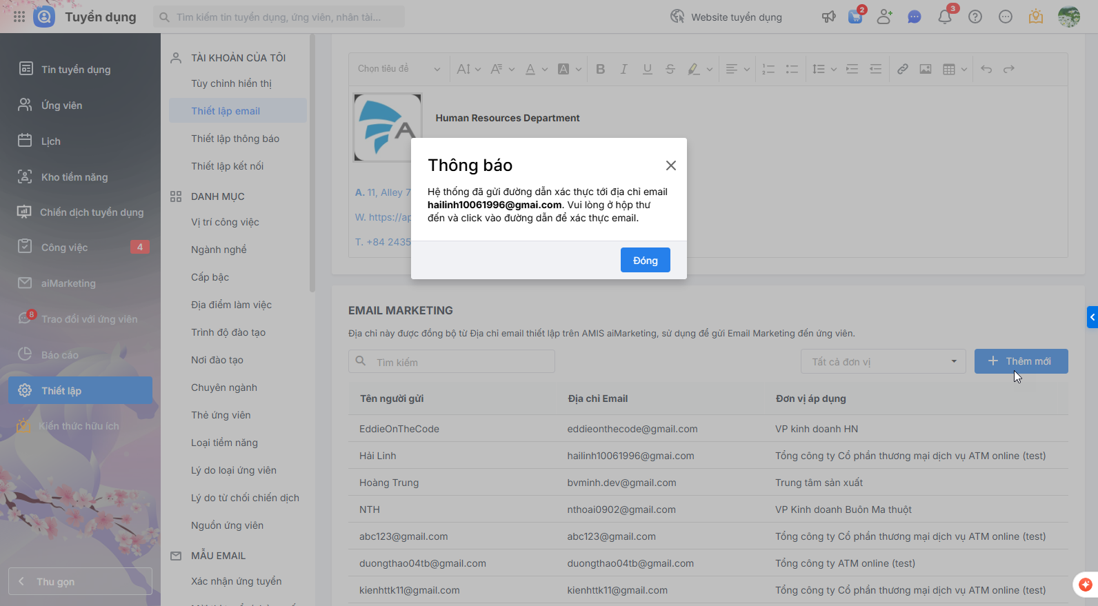 Sau khi thêm mới thành công, hệ thống sẽ gửi đường dẫn xác thực tới địa chỉ email\ truy cập link xác thực để hoàn tất xác thực sử dụng email này làm email gửi email marketing đến ứng viên.