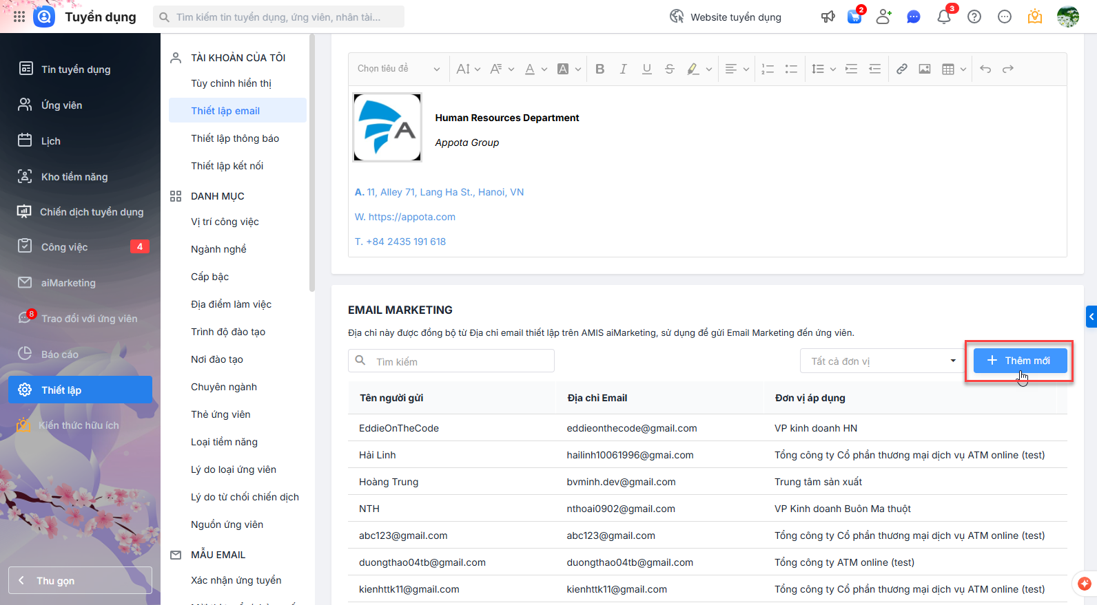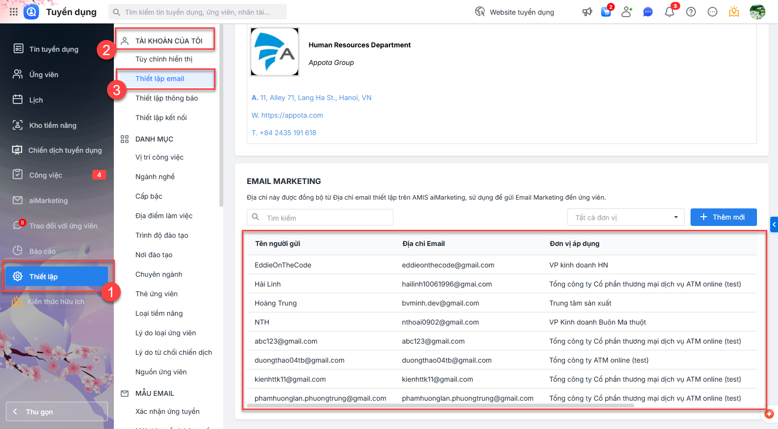 Tại Thiết lập\ Tài khoản của tôi\ Thiết lập email\ Email marketing: hiển thị danh sách email được đồng bộ từ địa chỉ email thiết lập trên aiMarketing, sử dụng để gửi email marketing đến ứng viên.