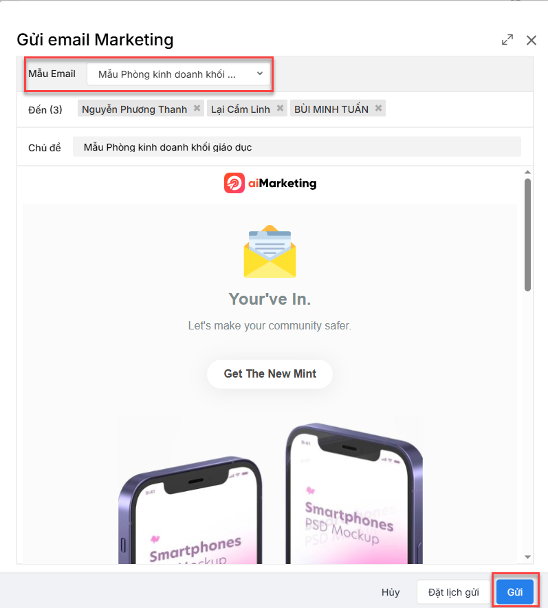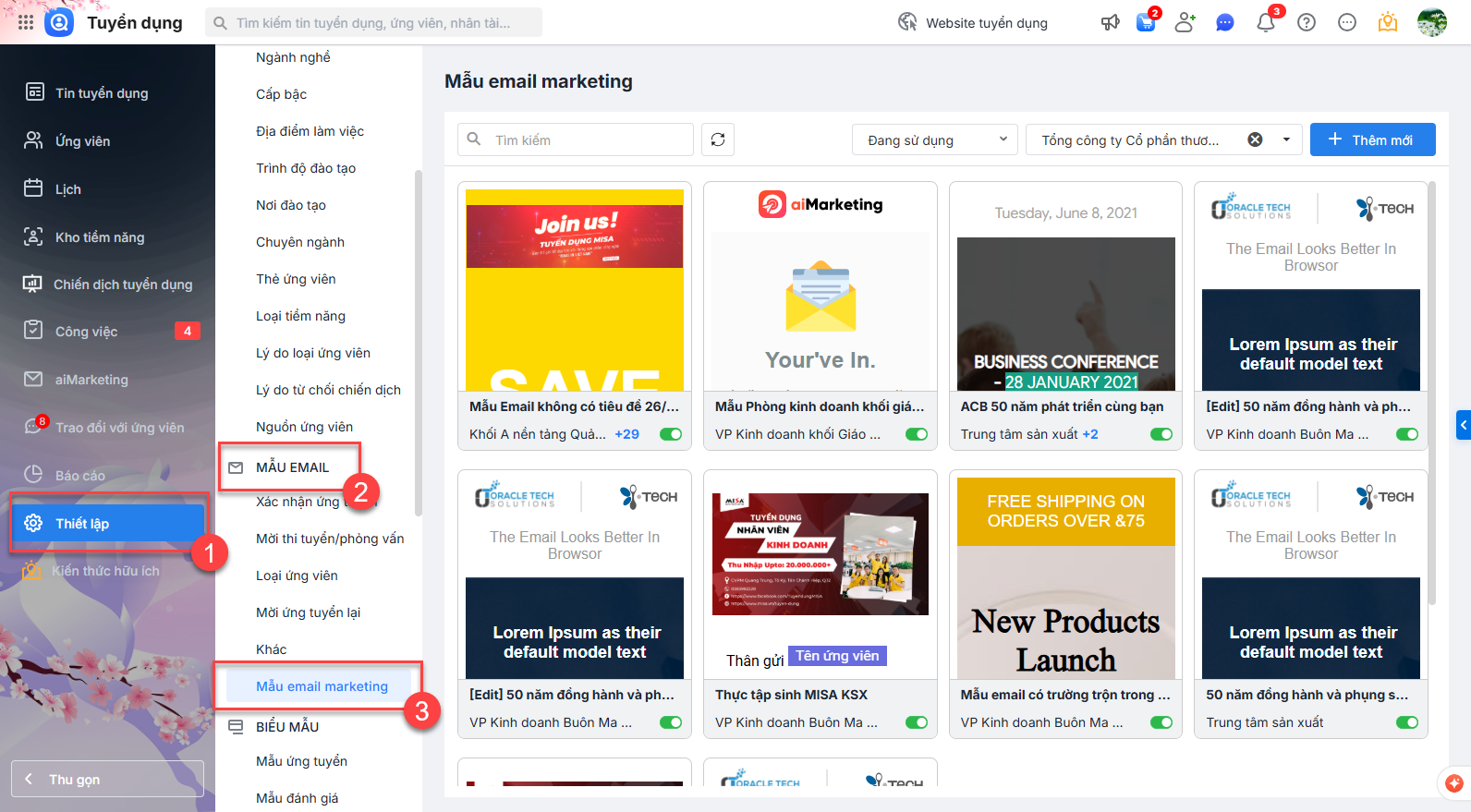 Tại Thiết lập\ Mẫu email\ Mẫu email marketing: hiển thị danh sách mẫu email đồng bộ về từ aiMarketing.