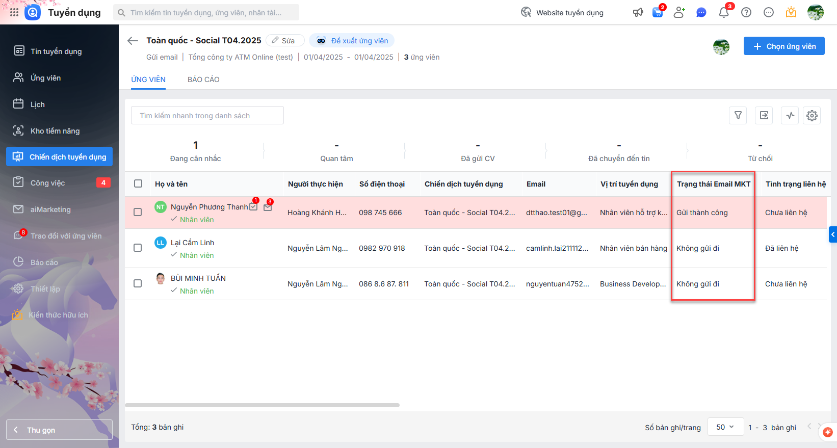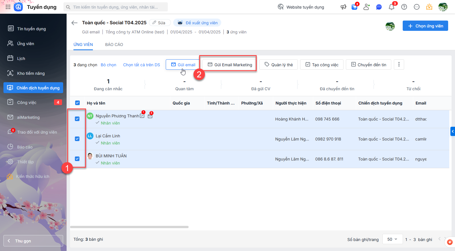 Tại chi tiết Chiến dịch tuyển dụng\ tích chọn các nhân viên cần gửi email\ nhấn Gửi email marketing.