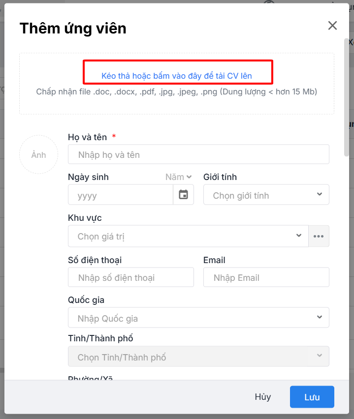 Bước 2: Tải file CV ứng viên lên hệ thống (Dung lượng < 15Mb).