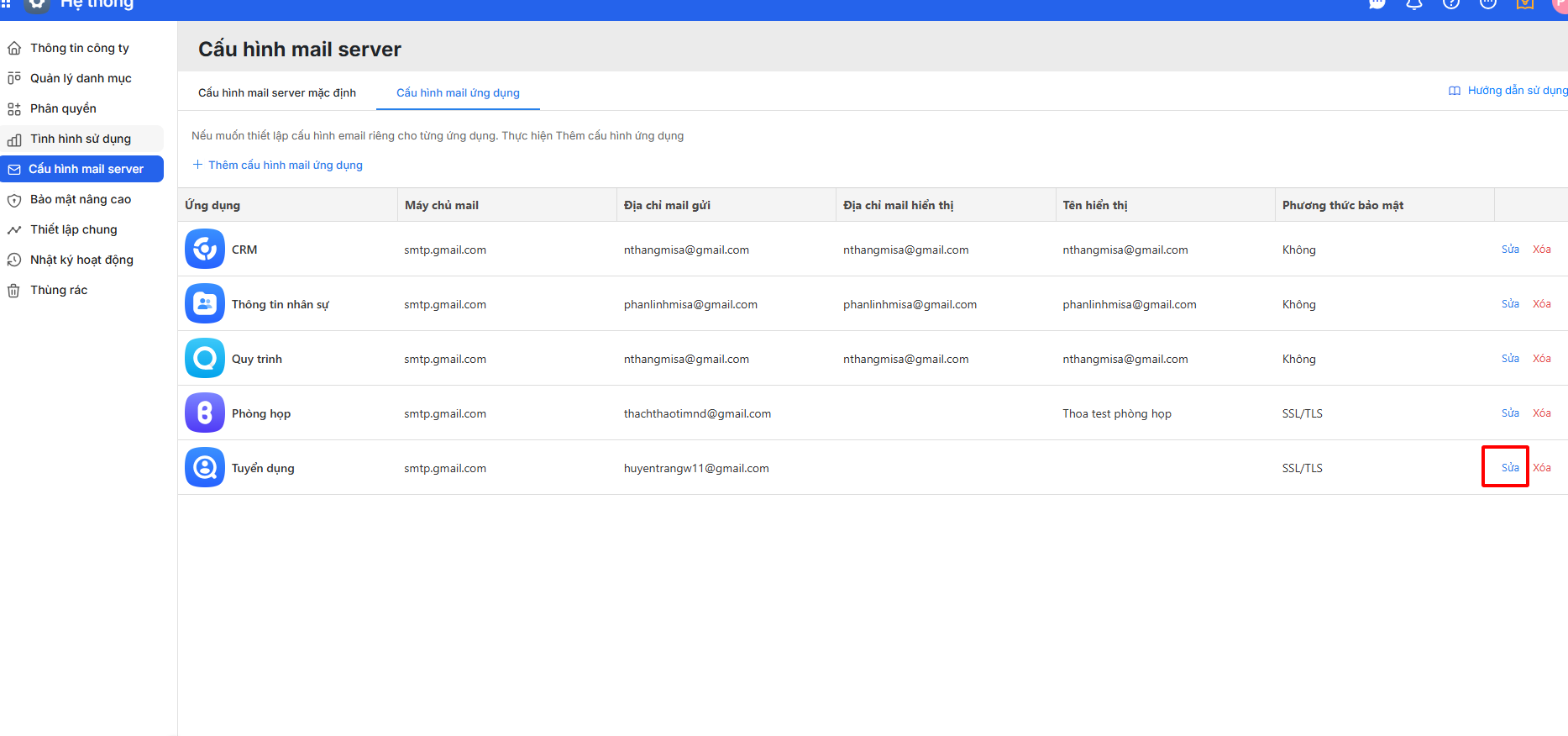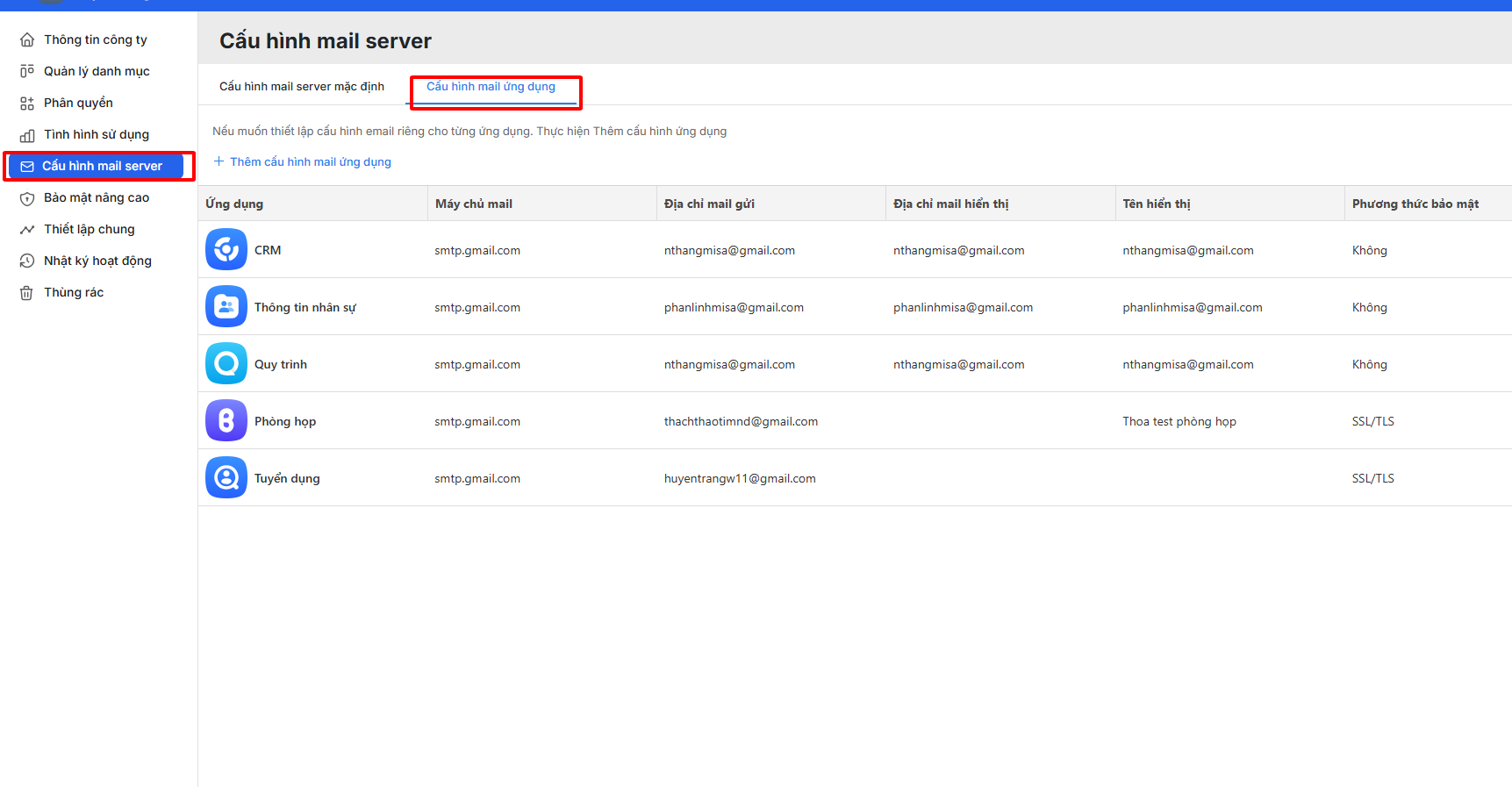Bước 2: Chọn Cấu hình mail Server\ Cấu hình mail ứng dụng\ Thêm cấu hình mail ứng dụng cho AMIS Tuyển dụng