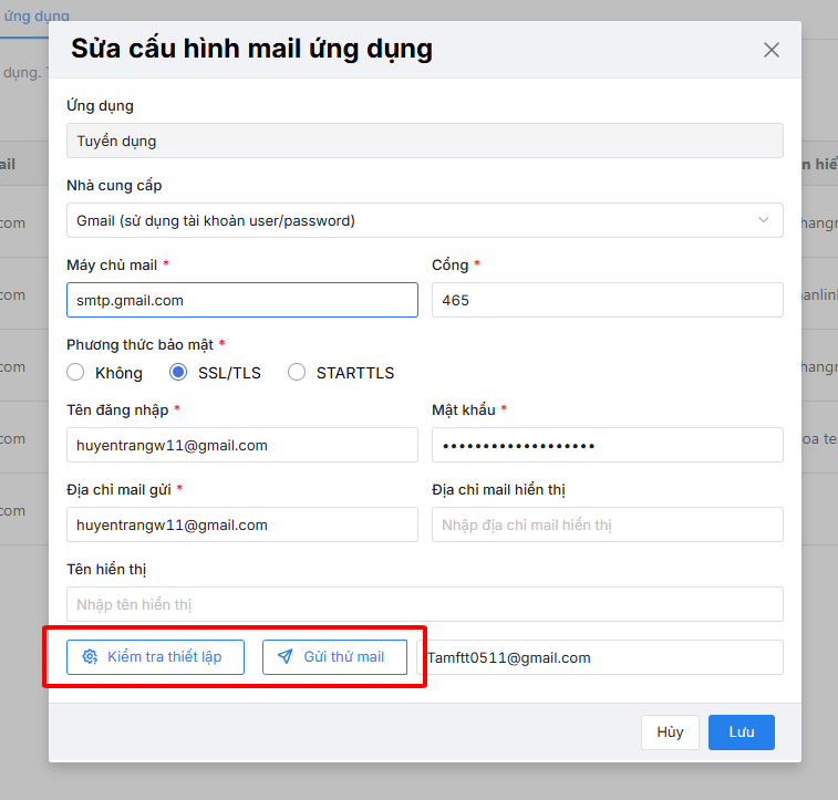 Bước 3: Điền bổ sung các thông tin cần thiết, trong đó trường có dấu * là bắt buộc. Sau đó có thể Kiểm tra thiết lập mail hoặc gửi thử