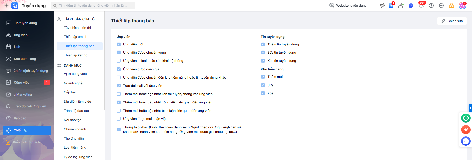 Thiết lập tuỳ chọn các loại thông báo nhận trên ứng dụng Amis tuyển dụng