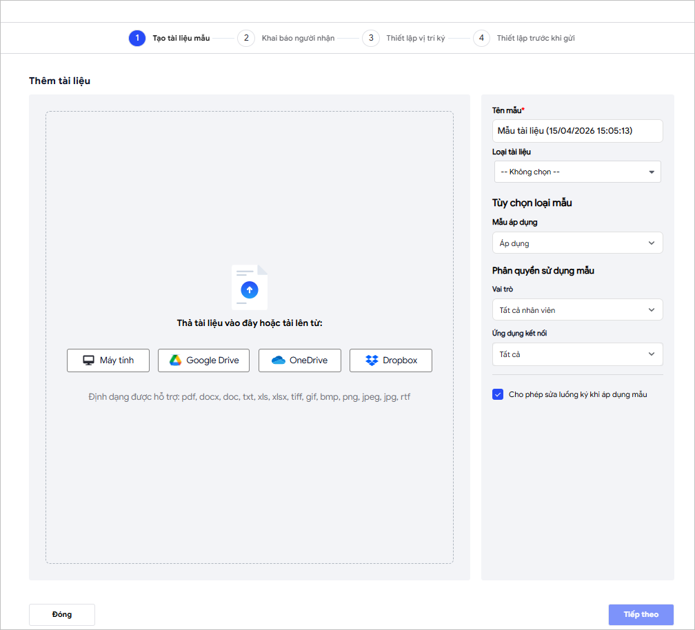 Bước 2: Tải lên file mẫu tài liệu\ khai báo thông tin (Tên mẫu, Phân quyền sử dụng mẫu).