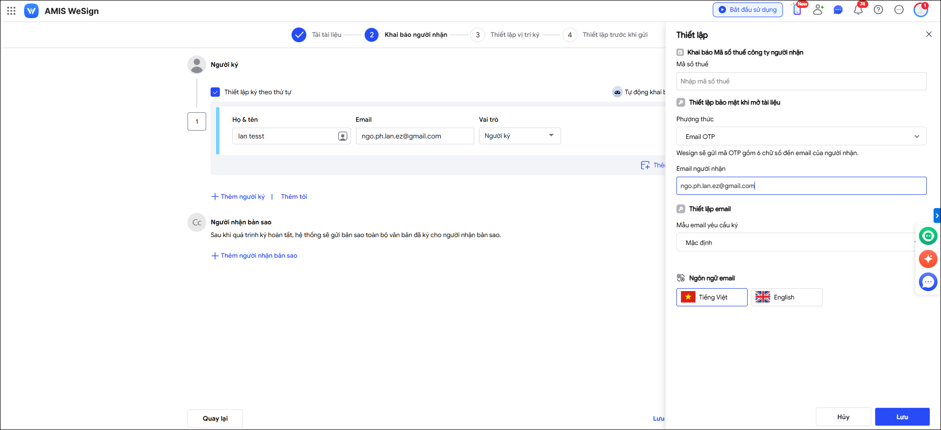 Tại màn hình tạo tài liệu, bước khai báo người nhận\ nhấn biểu tượng bánh răng cài đặt người nhận\ chọn Thiết lập bảo mật khi mở tài liệu là Email OTP\ nhập email người nhận\ nhấn Lưu.