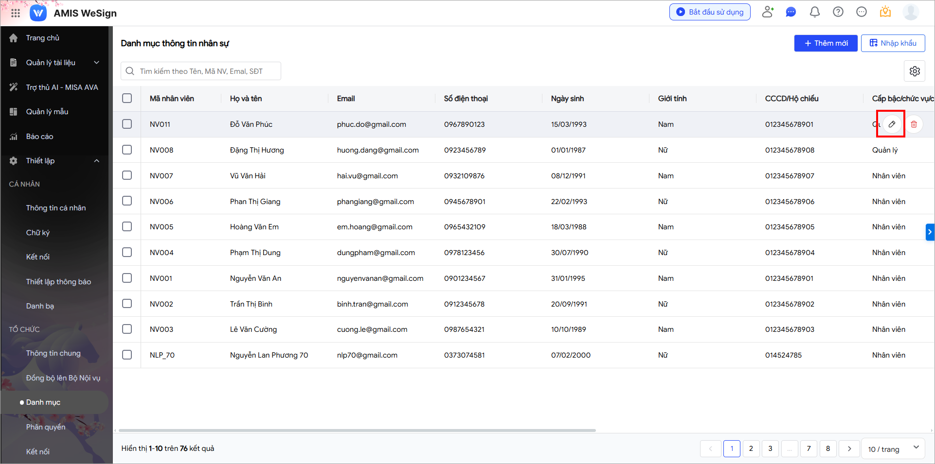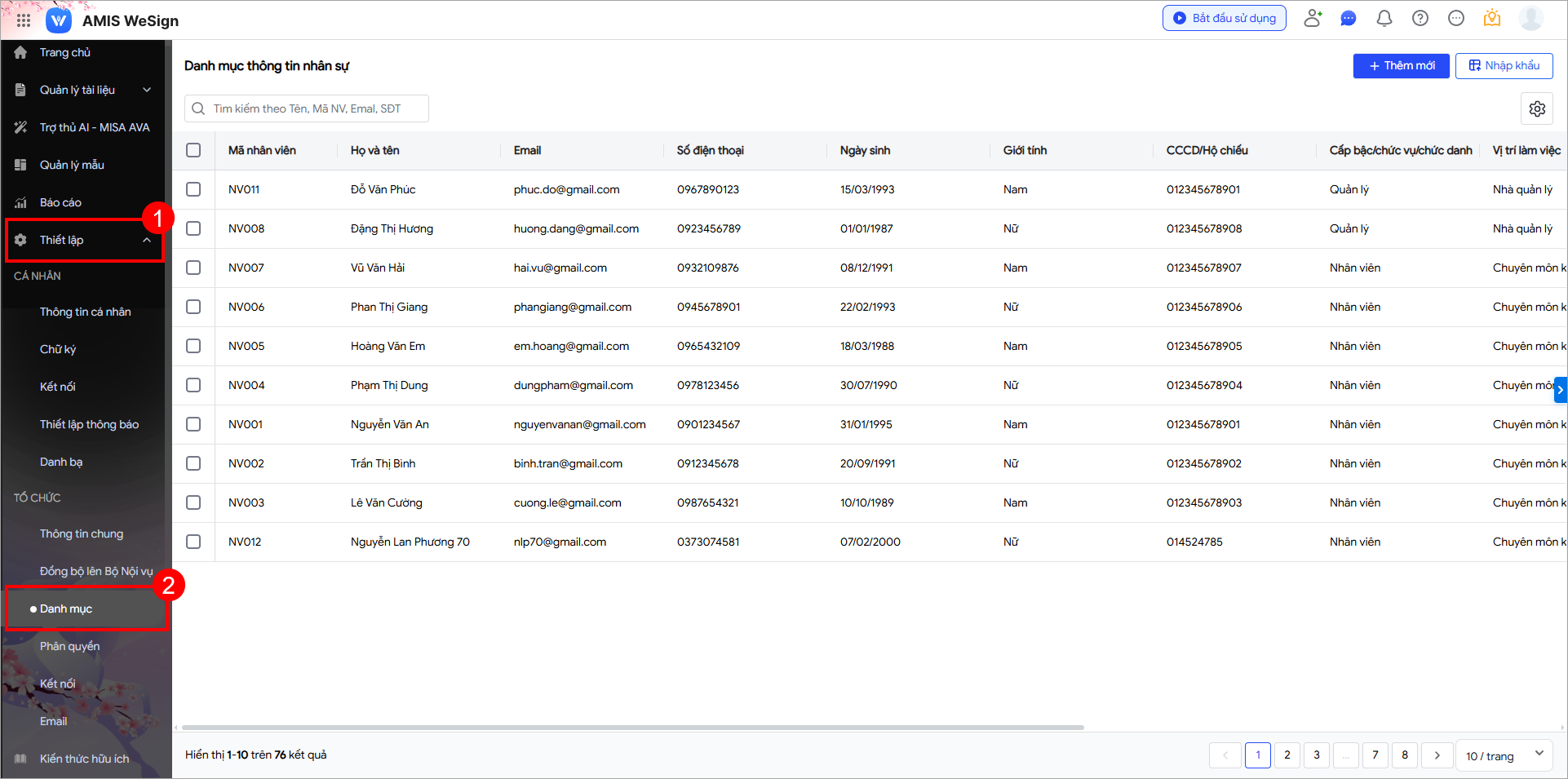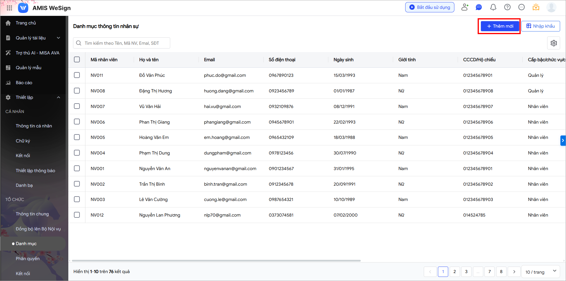 Bài viết hướng dẫn tạo và quản lý danh mục thông tin nhân sự trên AMIS WeSign.