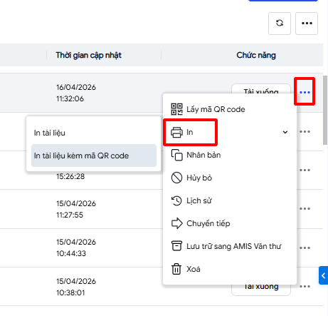 \ chọn In\ In tài liệu kèm mã QR code.