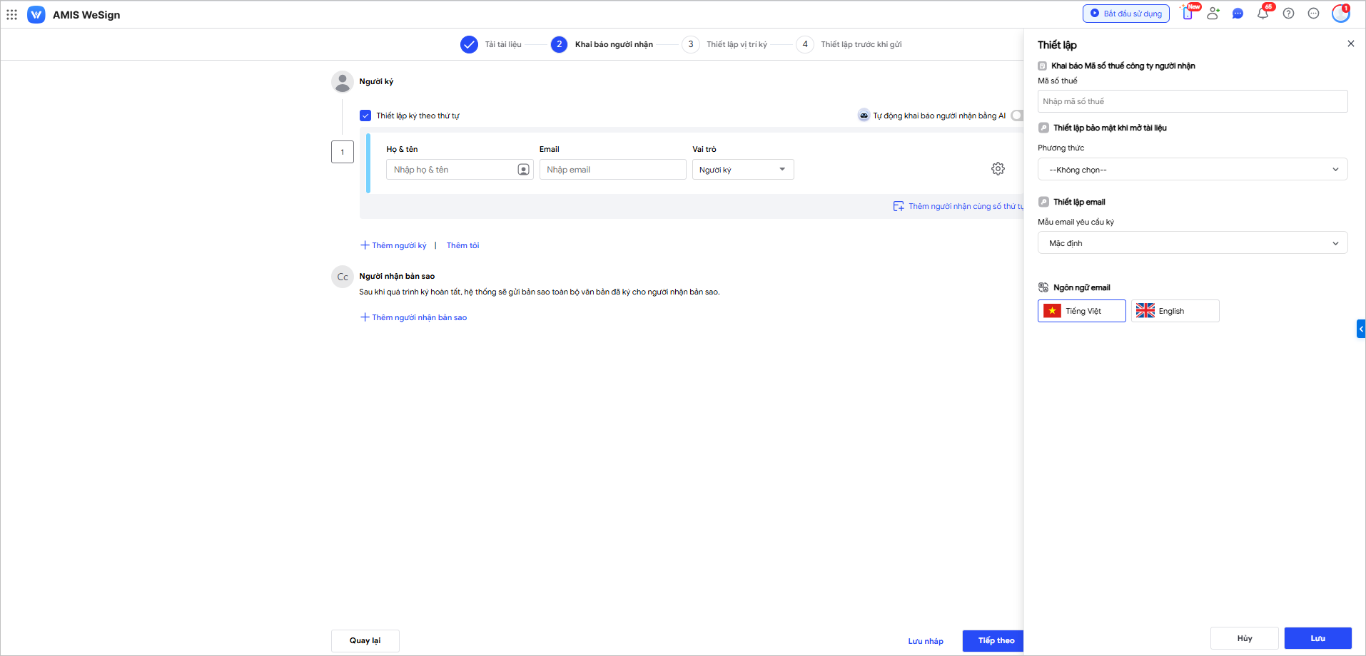 • Trong quá trình khai báo người nhận, có thể thực hiện thiết lập ký theo thứ tự bằng cách tích chọn Thiết lập ký theo thứ tự.
