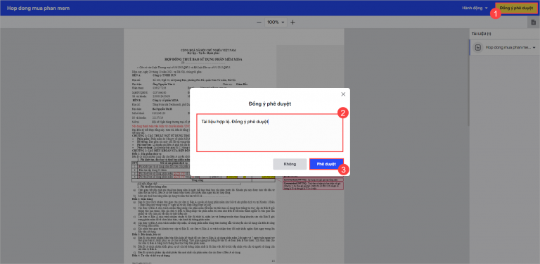 - Nếu tài liệu hợp lệ\ nhấn Đồng ý phê duyệt\nhập lý do đồng ý\ nhấn Phê duyệt. Tài liệu sẽ được chuyển đến cho người ký để thực hiện ký tài liệu.