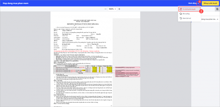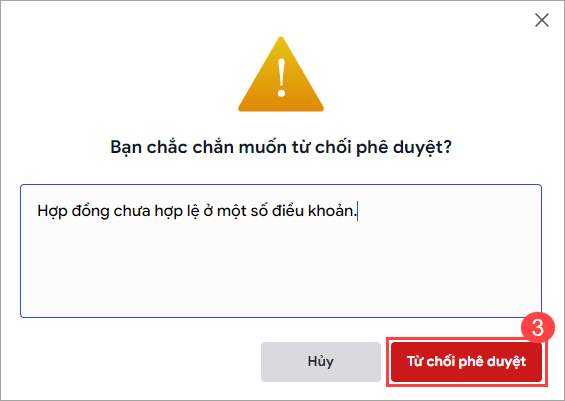 - Nếu tài liệu không hợp lệ, chọn Hành động\ Từ chối phê duyệt\ nhập lý do\ nhấn Từ chối. Tài liệu bị từ chối sẽ được chuyển về cho người gửi để kiểm tra lại và thực hiện tạo quy trình ký mới.