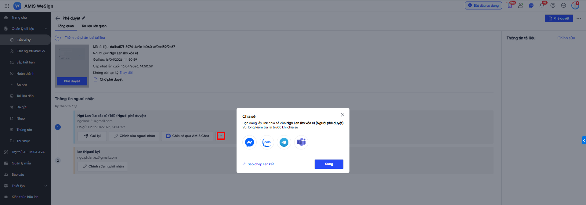 tại dòng thông tin người nhận\ nhấn Sao chép liên kết hoặc chia sẻ liên kết tài liệu trực tiếp qua các ứng dụng như Zalo, Messenger, Telegram, Microsoft teams để gửi cho người nhận tài liệu.