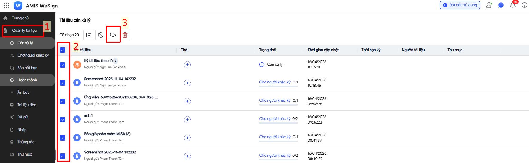 Trên giao diện Quản lý tài liệu\ chọn nhiều tài liệu cần tải\ nhấn biểu tượng tải xuống