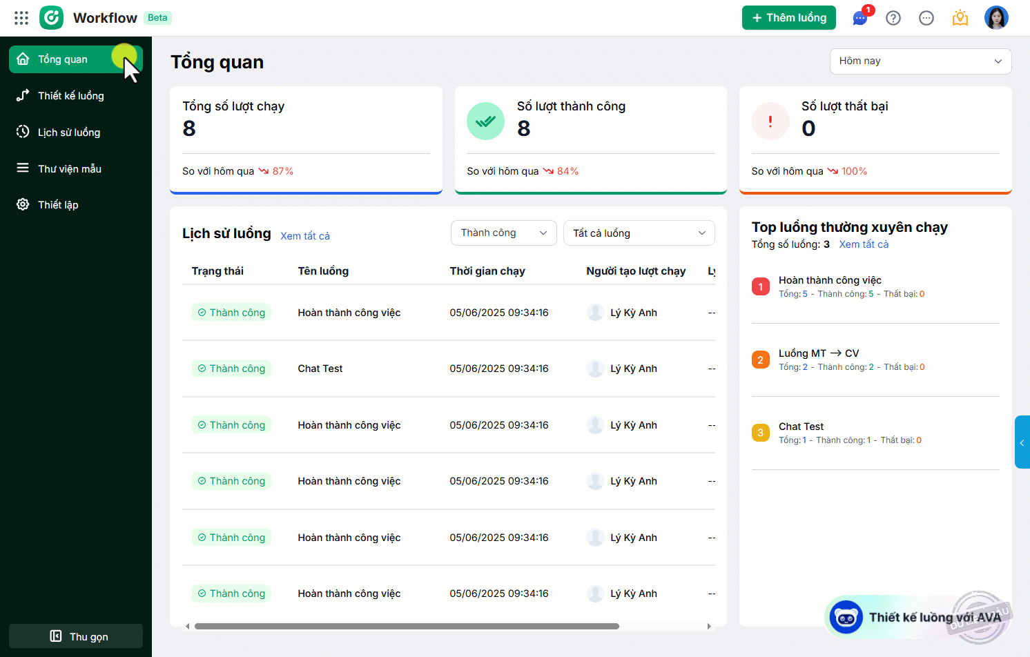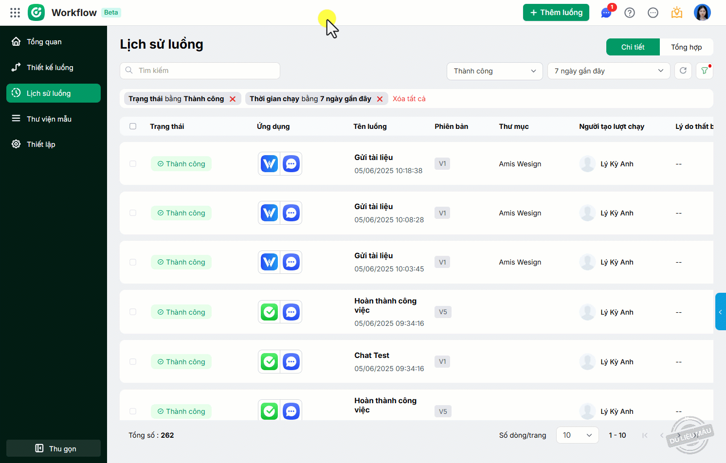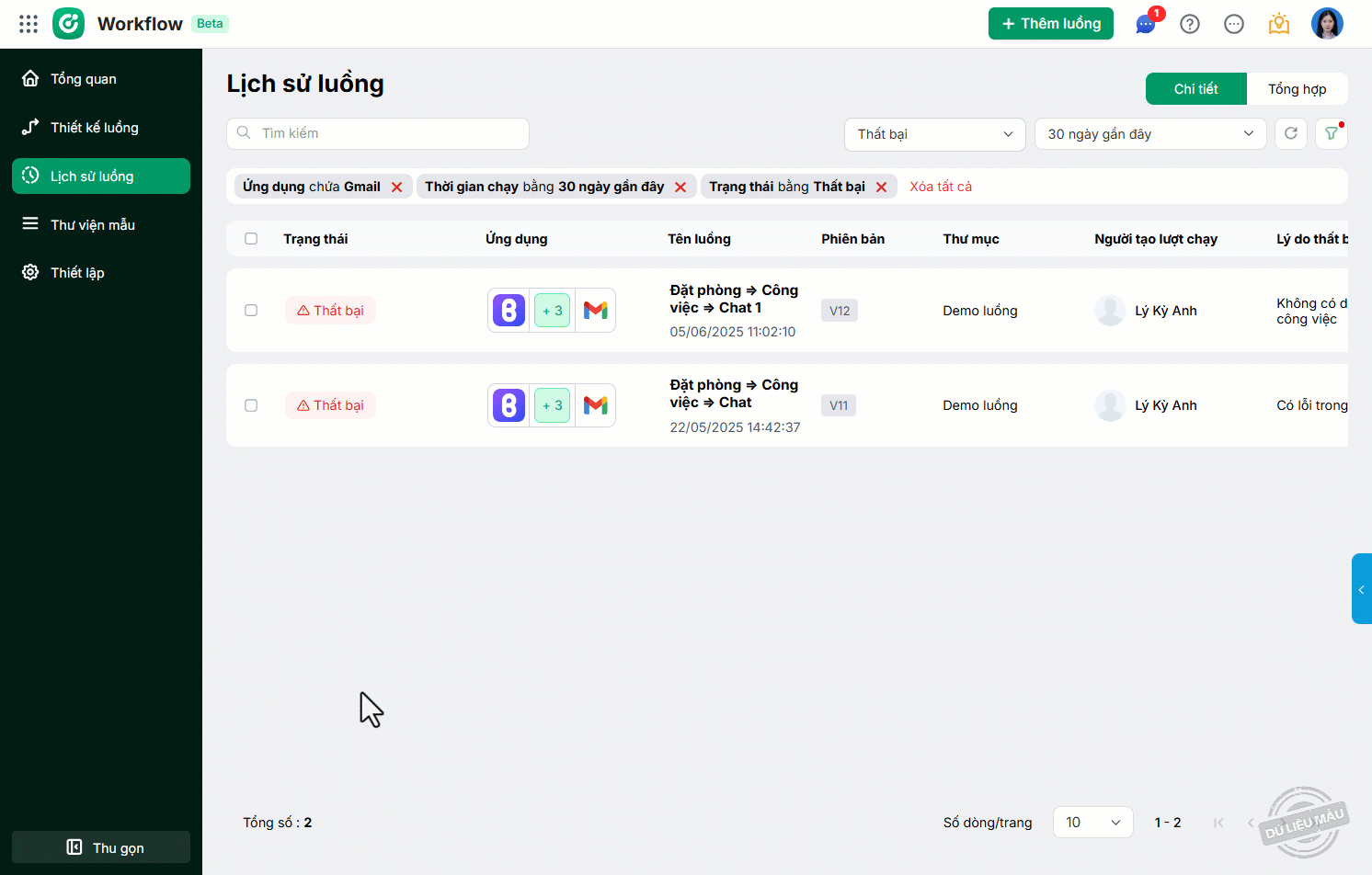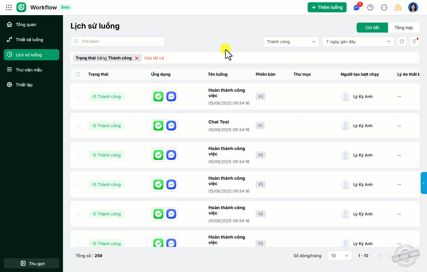 Tổng hợp các lượt chạy thành công/thất bại theo từng luồng, anh/chị nhấn vào từng luồng để xem chi tiết các lượt chạy của luồng đó.