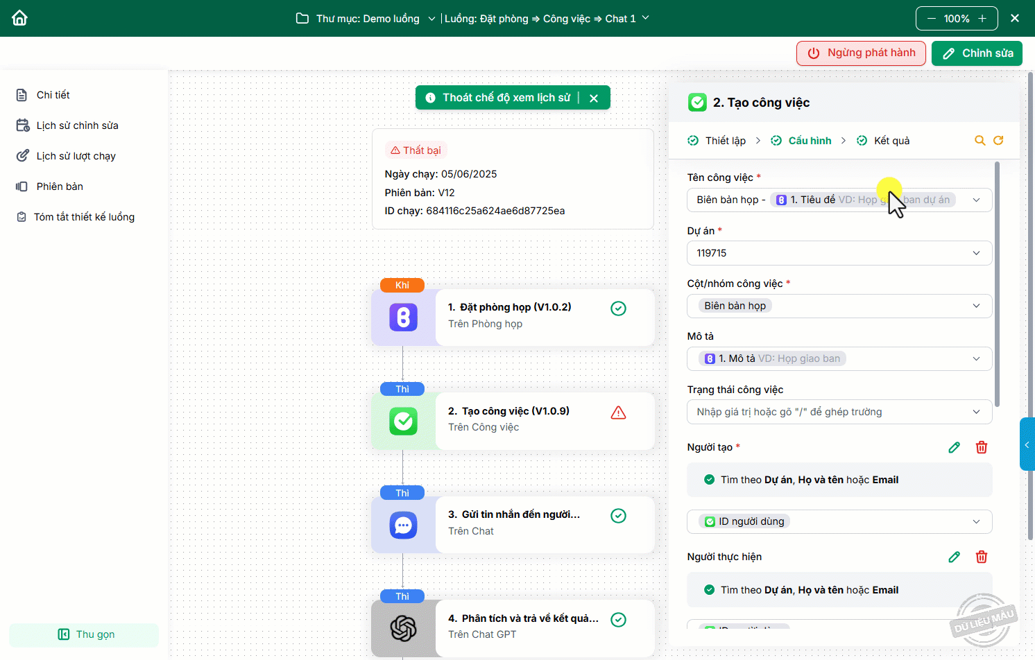 Đối với các lượt chạy thất bại, anh/chị nhấn vào lượt chạy thất bại để xem nguyên nhân.